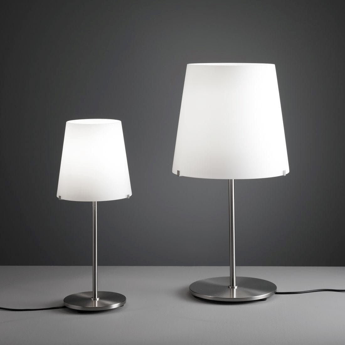 Table lamp with diffused light and dimmable by switch button. Frame made of brushed nickel-plated metal. Opaline blown glass diffuser. Black power cable, dimmer and plug. European two-pole plug. Bulb not included.