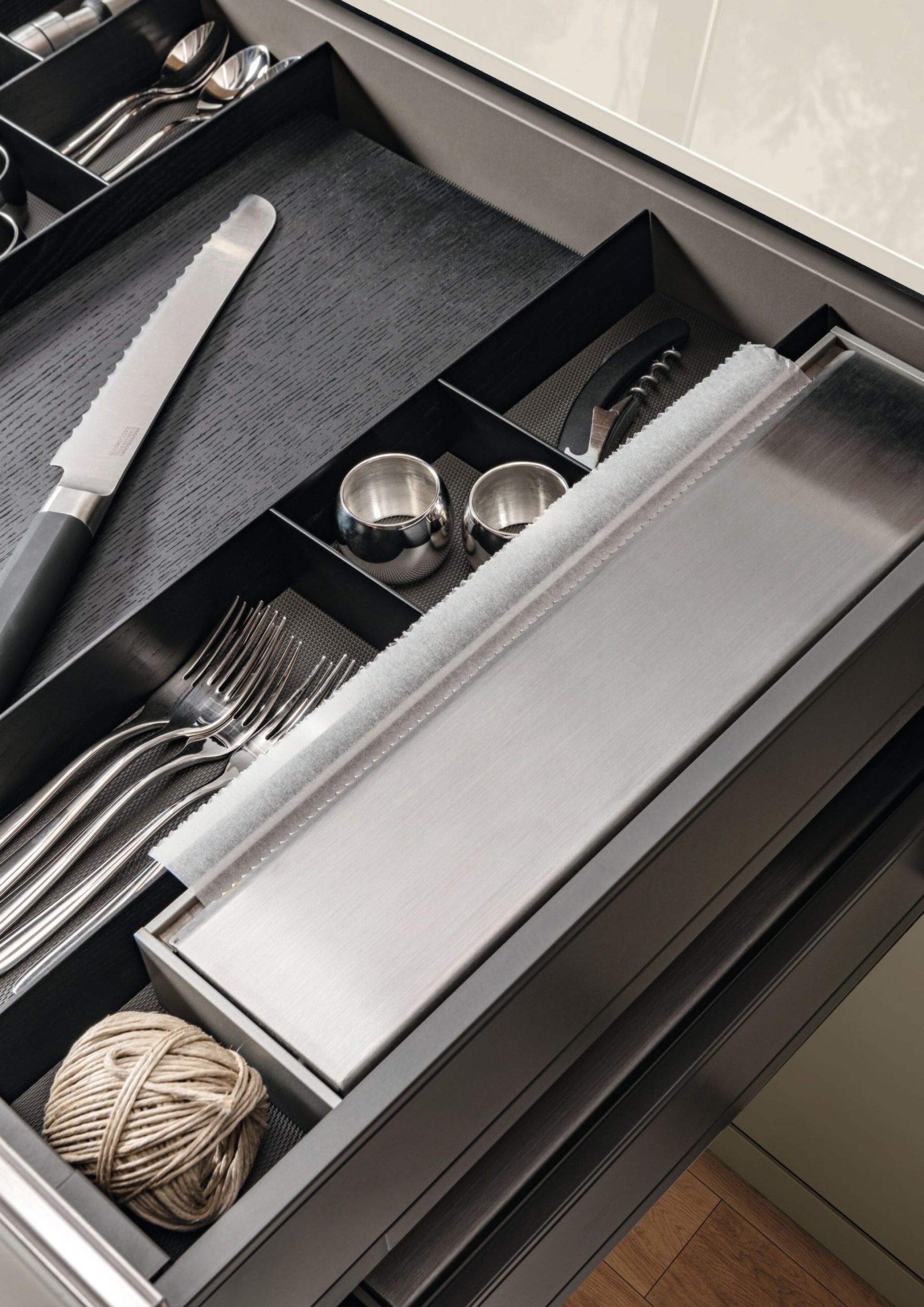 Pure, minimalist shapes define the 36e8 kitchen, with a seamlessly integrated top, door and side panel, and handles you barely can tell are there. Wall–mounted base and tall units are the distinctive feature of the design, giving the composition a sense of lightness and creating a feeling of more space in the room. Due to its modular build, the range can also be remodelled, creating dynamic designs using different materials alongside one another, for a functional, ergonomic end result.