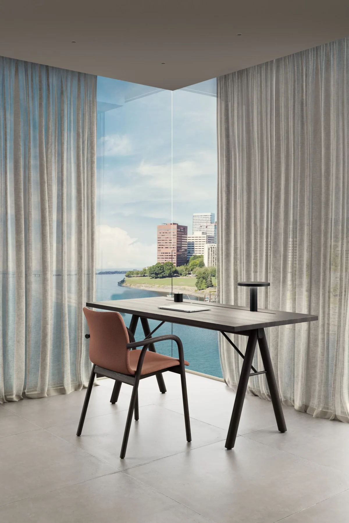 The A collection is composed by chairs and desks made of solid wood, a not very common material in the office environment. The concept of workplaces integrating home and office made a change, and I think it became more like that. The touch of our hands and bodies on the wood means coexisting with trees and getting closer to nature.