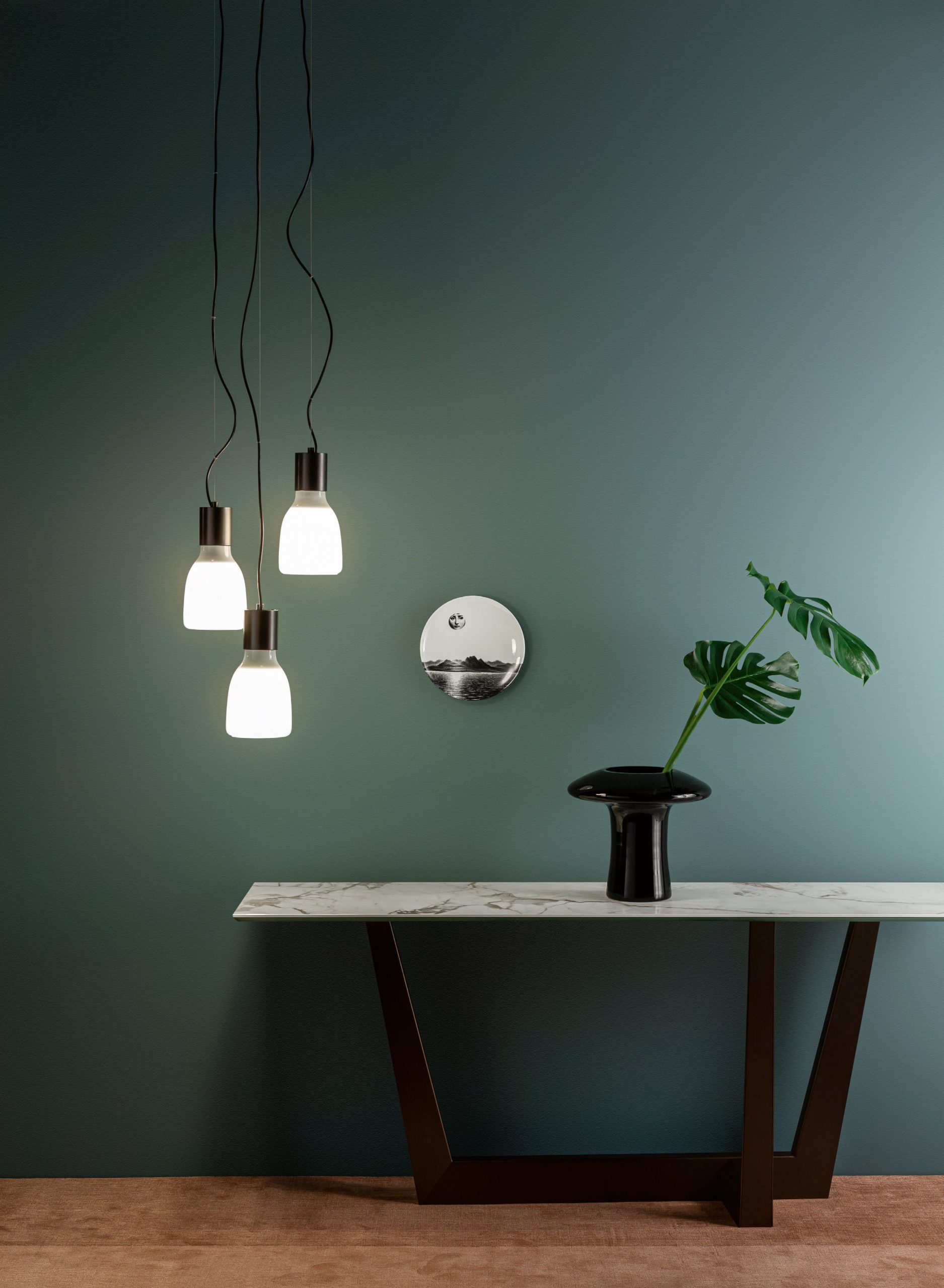 Like overlapping brush-strokes, the colours enhance the hand-crafted workmanship of the blown glass, as they come together and liaise with their surroundings: the Acquerelli lamp collection is expressed in table lamp models and suspensions, distinguished by the combination of glass lampshades and a matt lead-colour painted metal frame. The glass is available in milk white finish or, in the nuanced or striped version, in elegant petroleum or amber colour. The Acquerelli lamps come in two sizes, large or small. In the table version, the two sizes correspond to two different lampshade shapes. In the suspension version, the double glass option is also available, with the small lampshade combined with the large one to create a single ceiling lamp to generate surprising plays of light.
