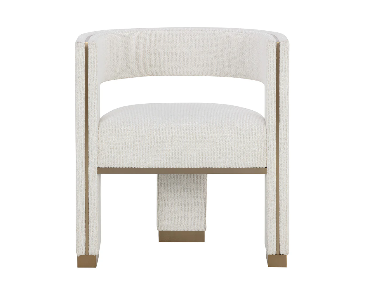 Perfectly poised with a distinct three-legged design, the Adamina Dining Armchair will leave a lasting impression. Powder-coated gold metal detailing enhances the plush texture of our rhea light barley performance fabric for a stylish seating solution. Performance fabric is moisture repellent, durable and easy to clean. Features & Benefits Stainless steel base features a durable powder-coated finish Comfortable cushions filled with foam