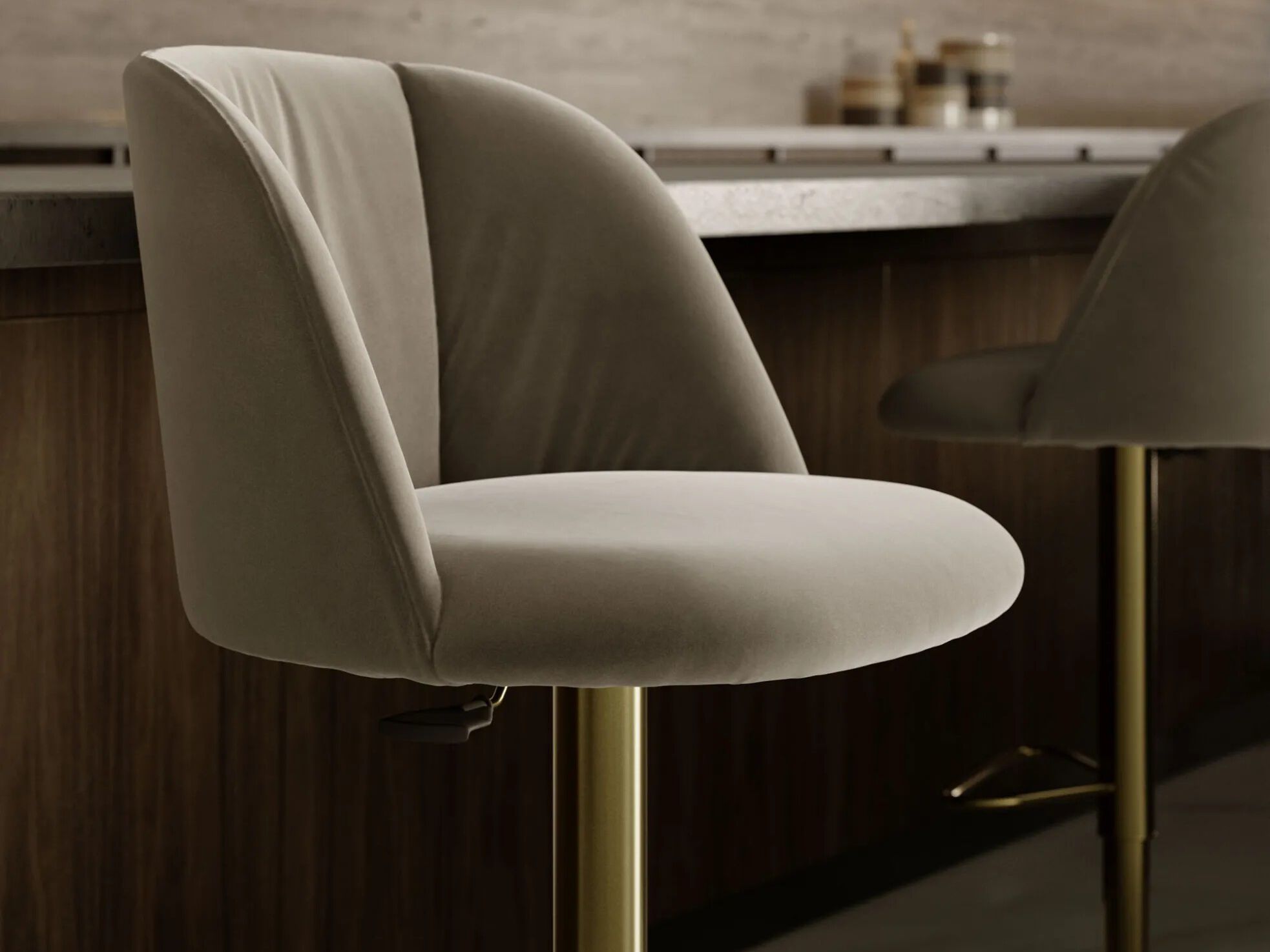 Swivel barstool with height adjustable and chromed gas lift piston, upholstered and covered in Gourmet fabric, Bouquet fabric, Nordic fabric, Premium Eco leather, Vegan Nabuk, Supreme Velvet, Kvadrat Field fabric, Kvadrat coda fabric, Prestige nappa leather and Premium nappa leather.