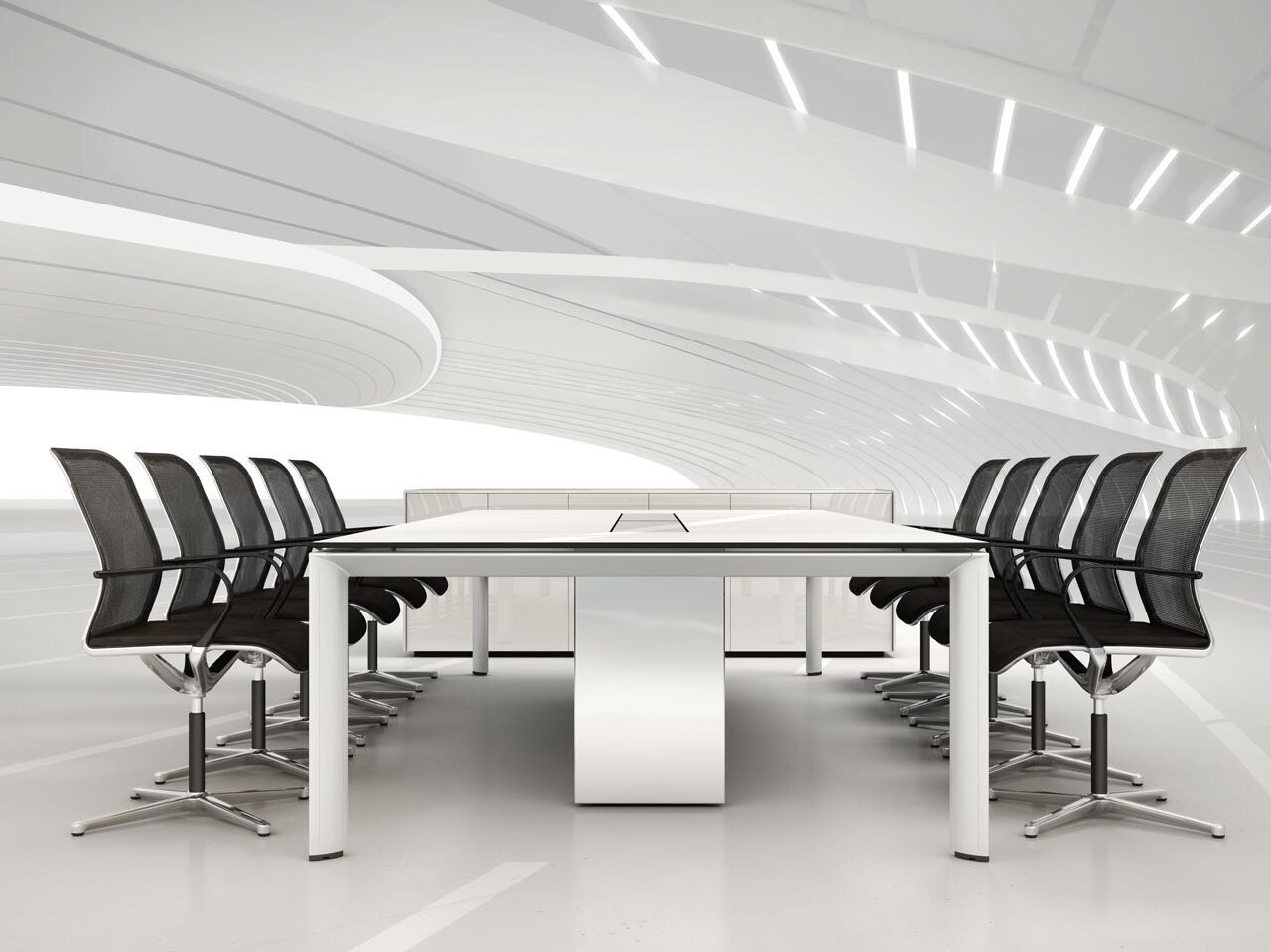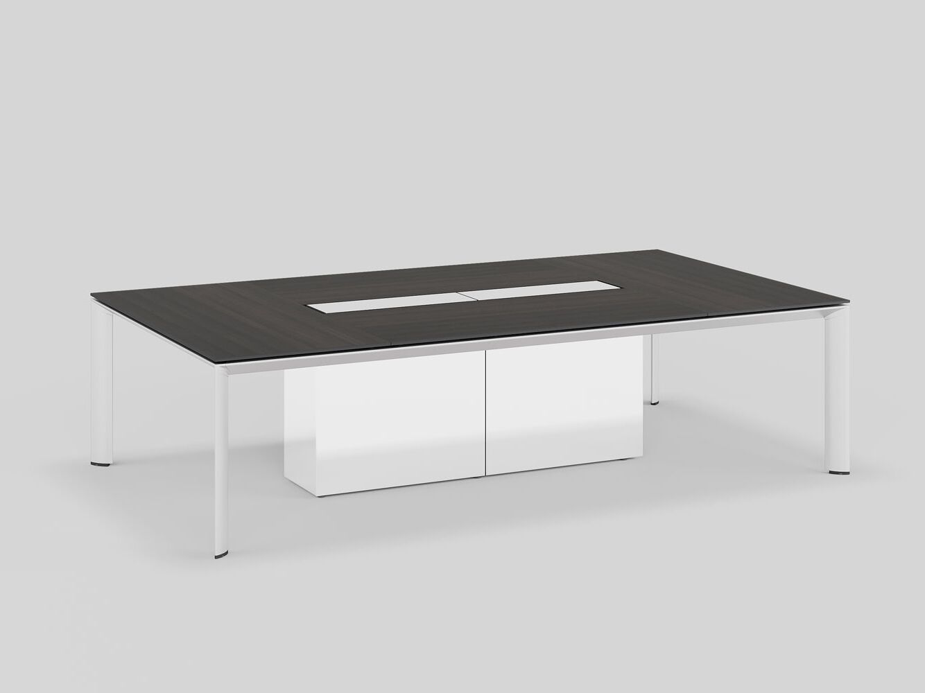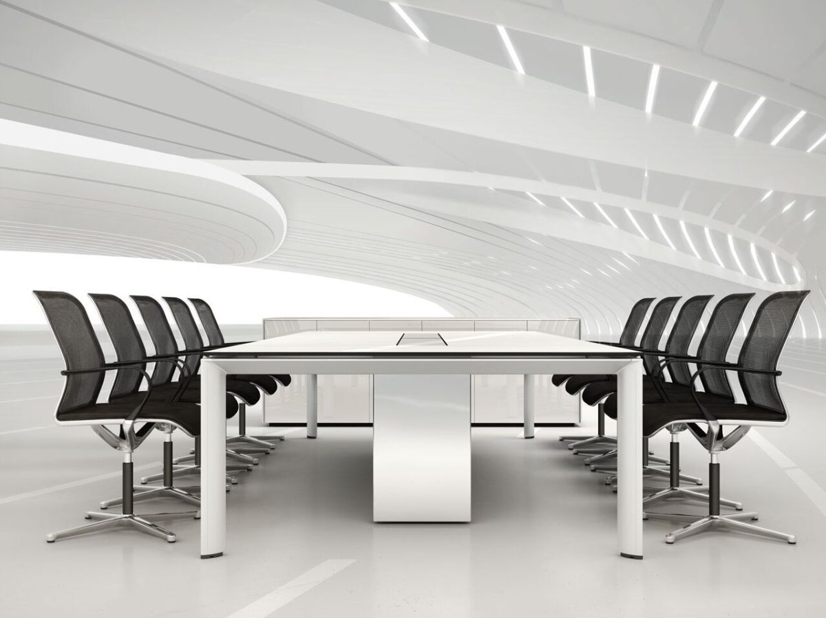 The AL conference table impresses with its length of up to 8 meters and provides a comfortable working space for up to 28 people. Its length varies from 156 to 800 cm, while the width remains constant at 156 cm. The table design features four table legs connected with a central console surrounded by an aluminum frame.