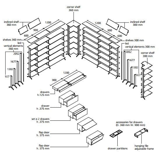 The structure can be equipped with containers, with tilt or sliding doors, and drawers, and is suitable for the installation of LEDs in the uprights, resulting in a subdued but highly suggestive scenographic effect.
