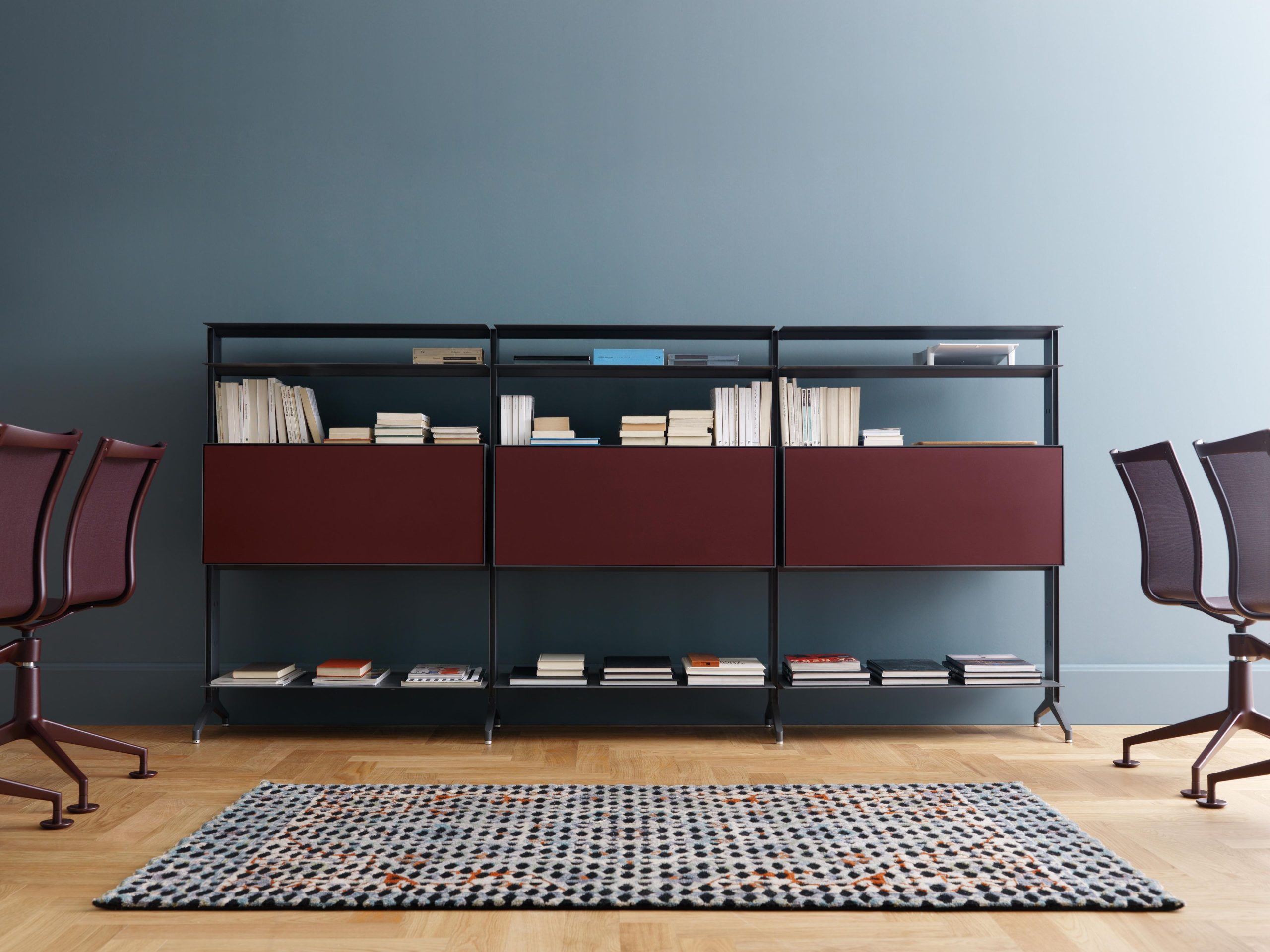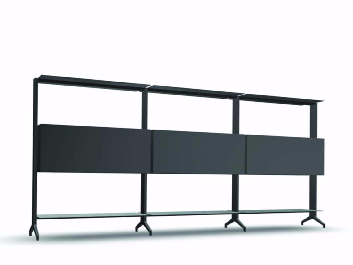 Sideboard with structure in extruded aluminium e shelves in stove enamelled aluminum and set of 2 drawers in lacquered mdf 360mm depth. Height adjustable feet in matt anodized aluminium.