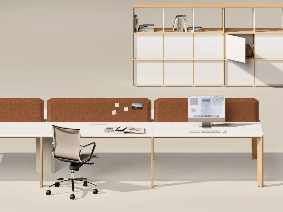 Alis expresses the perfect fusion of elegance and functionality, transforming the studios design rigour and sensibility into simple yet sophisticated elements. The collection consists of a system of workstation and semi-executive desks, meeting tables, bookshelves and storage solutions that seamlessly integrate with their setting, offering the ideal balance of rationality and character. The square and rectangular versions, alongside the 140 x 280 cm meeting table, offer versatile solutions to meet the needs of the contemporary workplace, while the bench, which can be customised with a fabric-covered screen and cable management, optimises collaborative working. The choice of finishes (white and oak) and materials is also rigorous and no frills: the tables are made with an aluminium structure coated in Microflex ultra-flexible laminate, and a top in white faced chipboard (made from 100% recycled wood). The bookshelf, made up of 2, 3 or 4 stackable modules (open or closed), echoes the same decorative style, and the oak of the melamine-faced tops perfectly matches that of the laminate legs, thanks to the companies within the Fantoni group working in synergy.