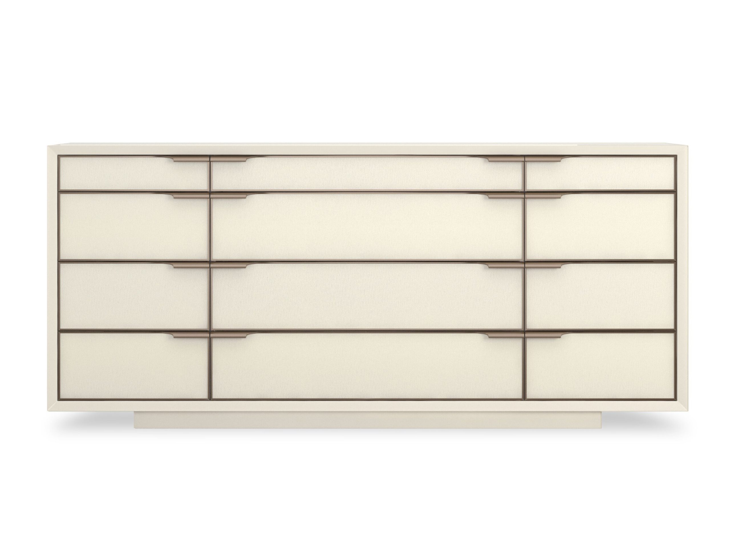 A lighter take on our All Wrapped Up mid-century modern dresser, this version is finished in Almond Milk on the case and plinth base. Each drawer front is wrapped in a beautifully textured vinyl with the appearance of pearlized silk. Casting a warm glow, metal drawer trim in Champagne Gold artfully incorporates soft edge pulls. This piece offers generous storage with soft-closing features and two felt-lined top drawers for an added note of luxury.
