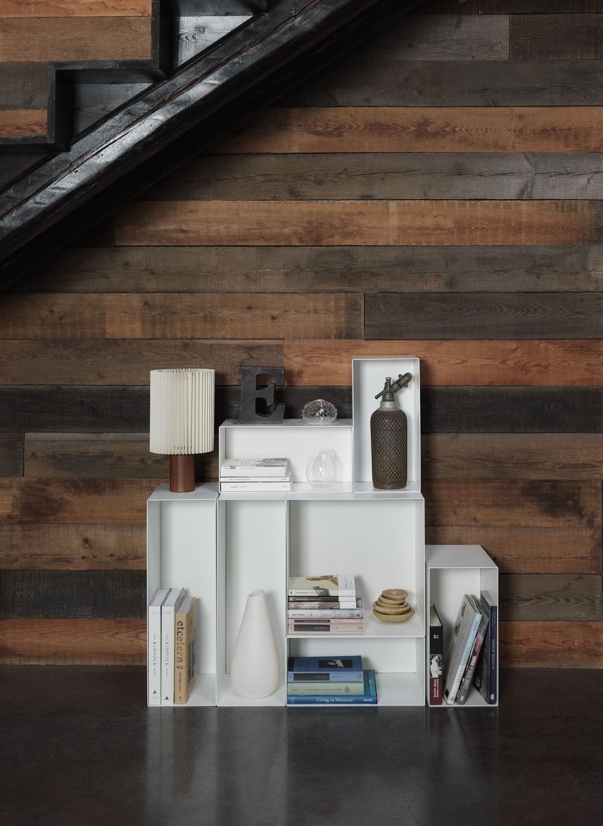 Lightness and strength upon first glance Alma is linear, but closer inspection reveals a random side. Three modules derive from the basic element small, medium and large which can be hanged and arranged to ones own taste. Furthermore, thanks to the fabric panels, it is possible to customize each module, making the bookcase unique and colorful.