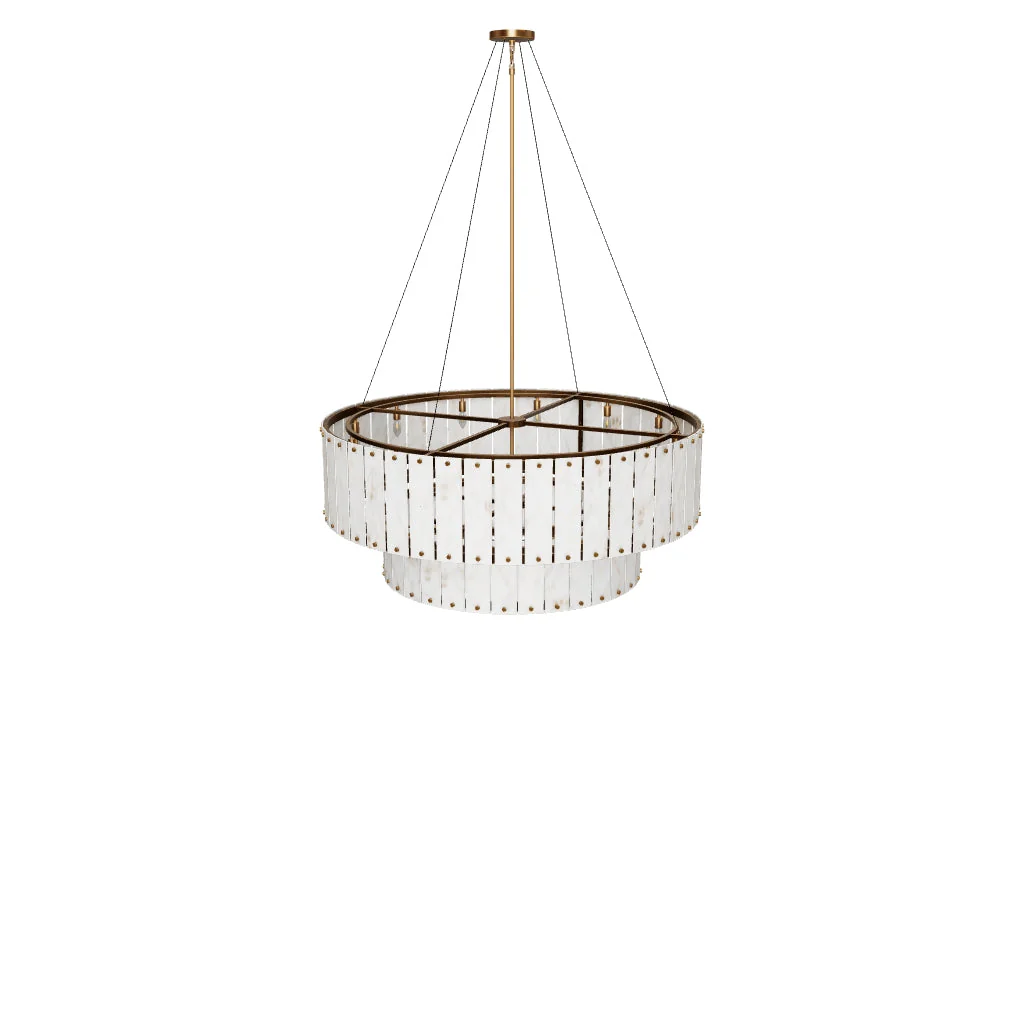 Striking and unforgettable, the Aspara Chandelier is a modern treasure that will make its presence felt in large spaces. This substantially-sized showpiece is masterfully crafted with two tiers of natural Spanish alabaster, prized for its translucency and soft cream colour. Each alabaster panel is sizeable and features unique veining that makes every chandelier one-of-a-kind.