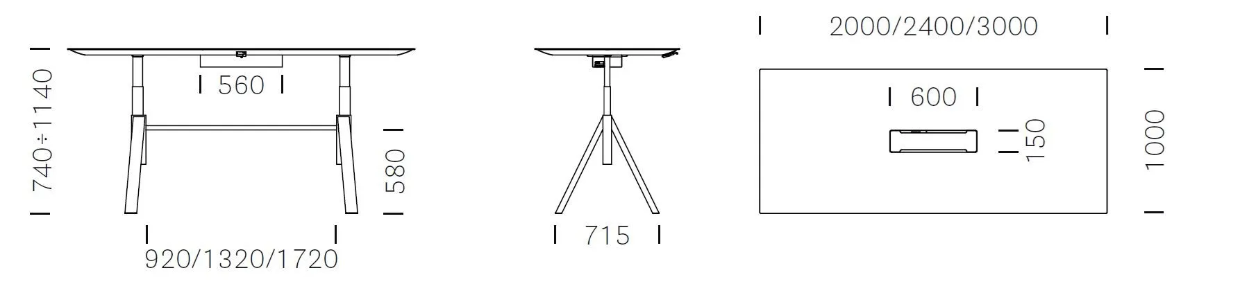 Two electric actuators, connected to a control unit and activated by two buttons placed under the top, move as one and allow to choose the ideal height of the top, from 740 to 1140 mm, to have maximum comfort during the workday.