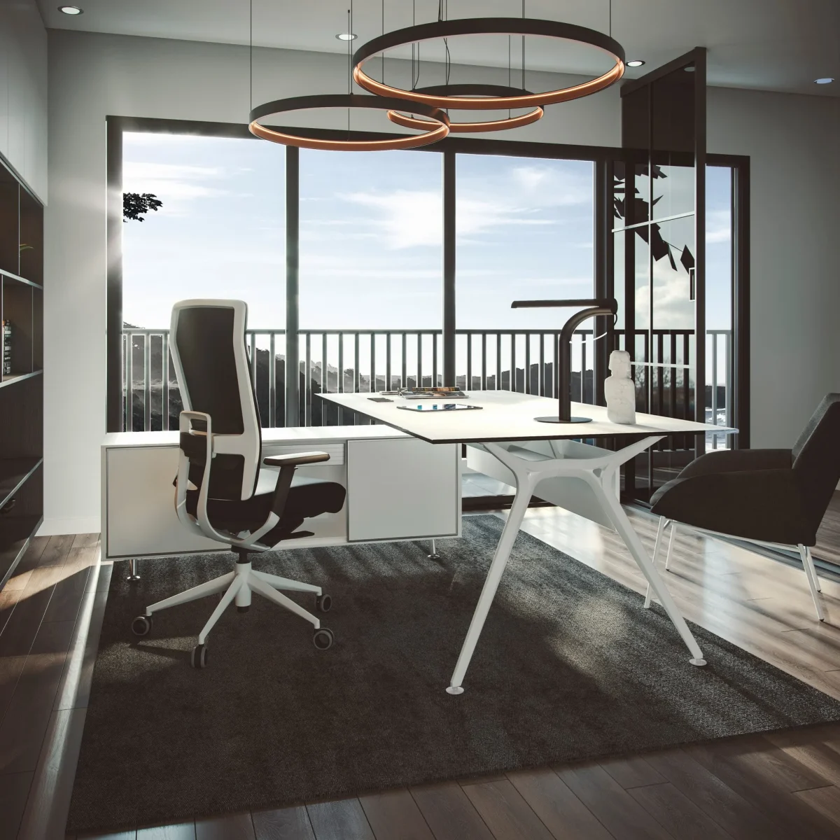 Arkitek is a program of desks which respond to an architectural vision for equipping offices: models that provide operative solutions incorporating a unique design and high quality materials, with a robust frame supporting a thin top in compact laminate or glass. With the use of organic forms that grant a contemporary character and freshness, Arkitek office desks allow to create working areas with personality. Arkitek, with support over filing or block, converts itself into a sober and practical combination, providing total functionality and greater organization to work spaces. Each Artitek model is intended for a specific office environment, such as, management desks, conference tables or work desks. Made entirely of aluminum, it is the result of extensive engineering development that gives the program great flexibility. Furthermore, Arkitek is offered in different frame finishes: aluminized, white, black, polished and chromed. With the aim of promoting sustainability and well-being, all the MFC boards incorporate a 0% formaldehyde certification as standard. With this system, Actiu reinforces the aim of providing unique solutions as well as top quality.
