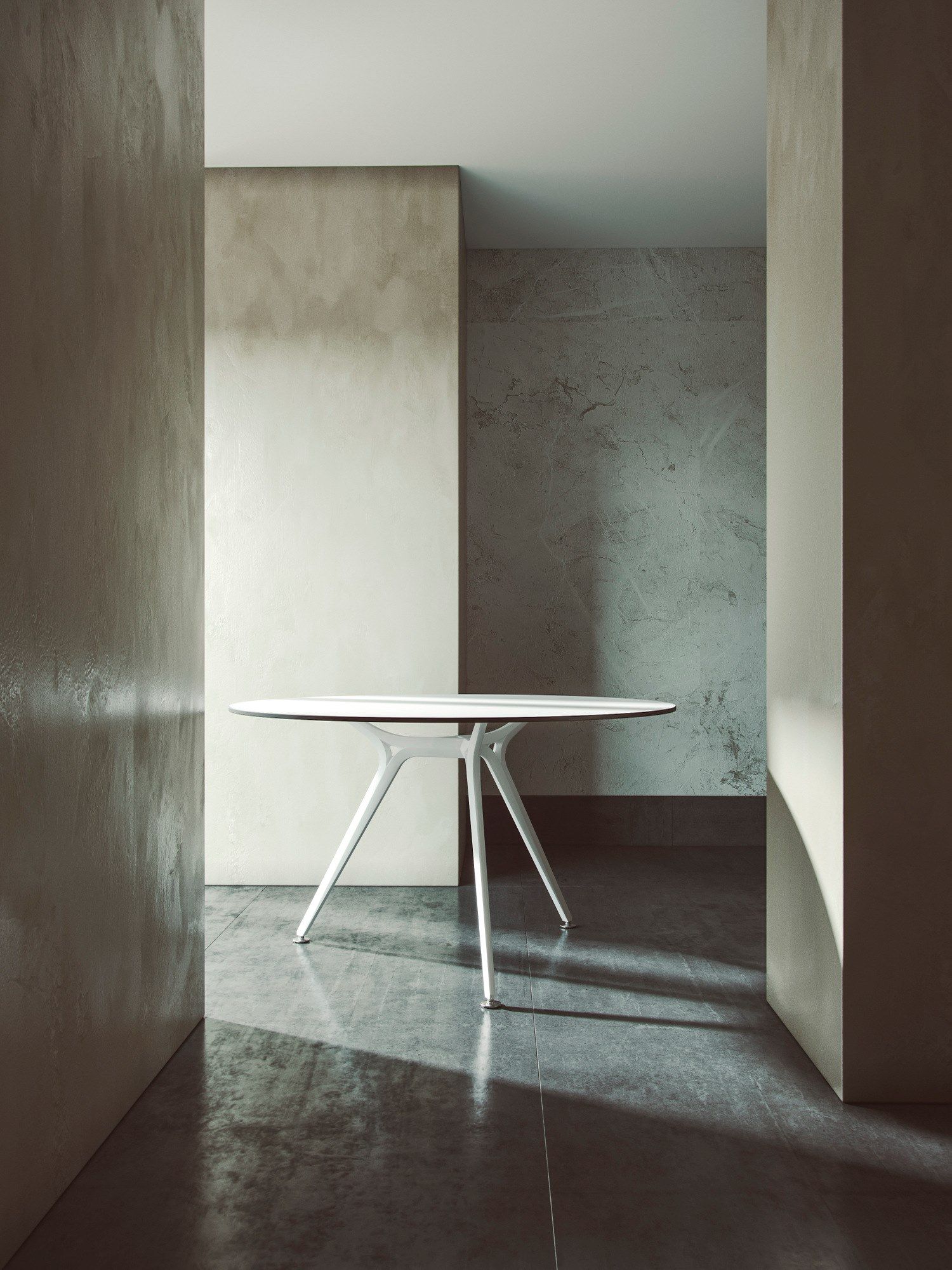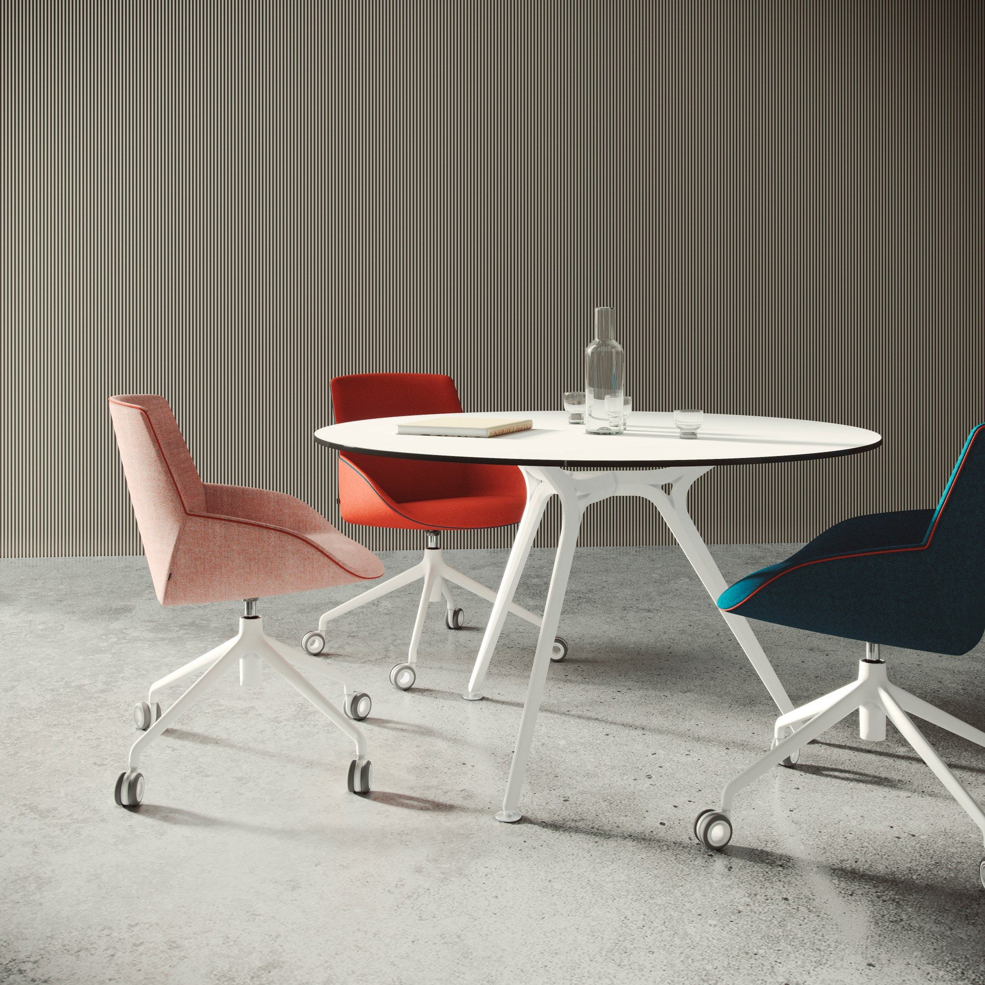 Arkitek is a round meeting table. Top in glass, MFC or laminate.