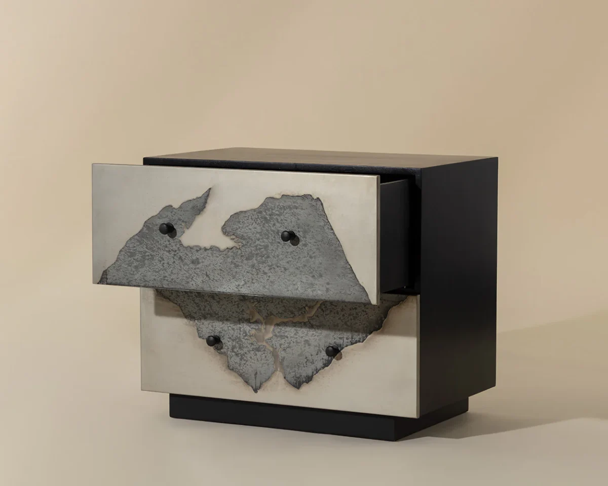 Make a bold statement with this unique nightstand. The drawers feature a one-of-a-kind patina finish, boldly contrasted with a black iron frame. Made in India. With refined craftsmanship, this design was brought to life by skilled local artisans. By nature, these materials develop unique imperfections such as markings and colour variations for a truly one-of-a-kind piece. Pictures shown reflect the lightest and darkest variations of our Arlington patina finish. Actual product may range between these finishes.