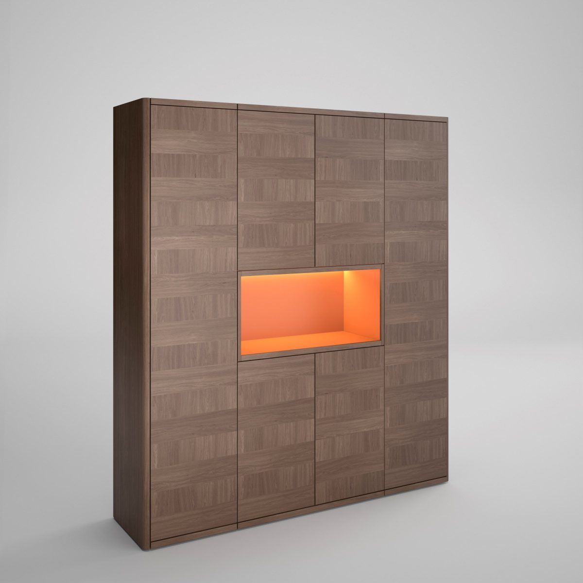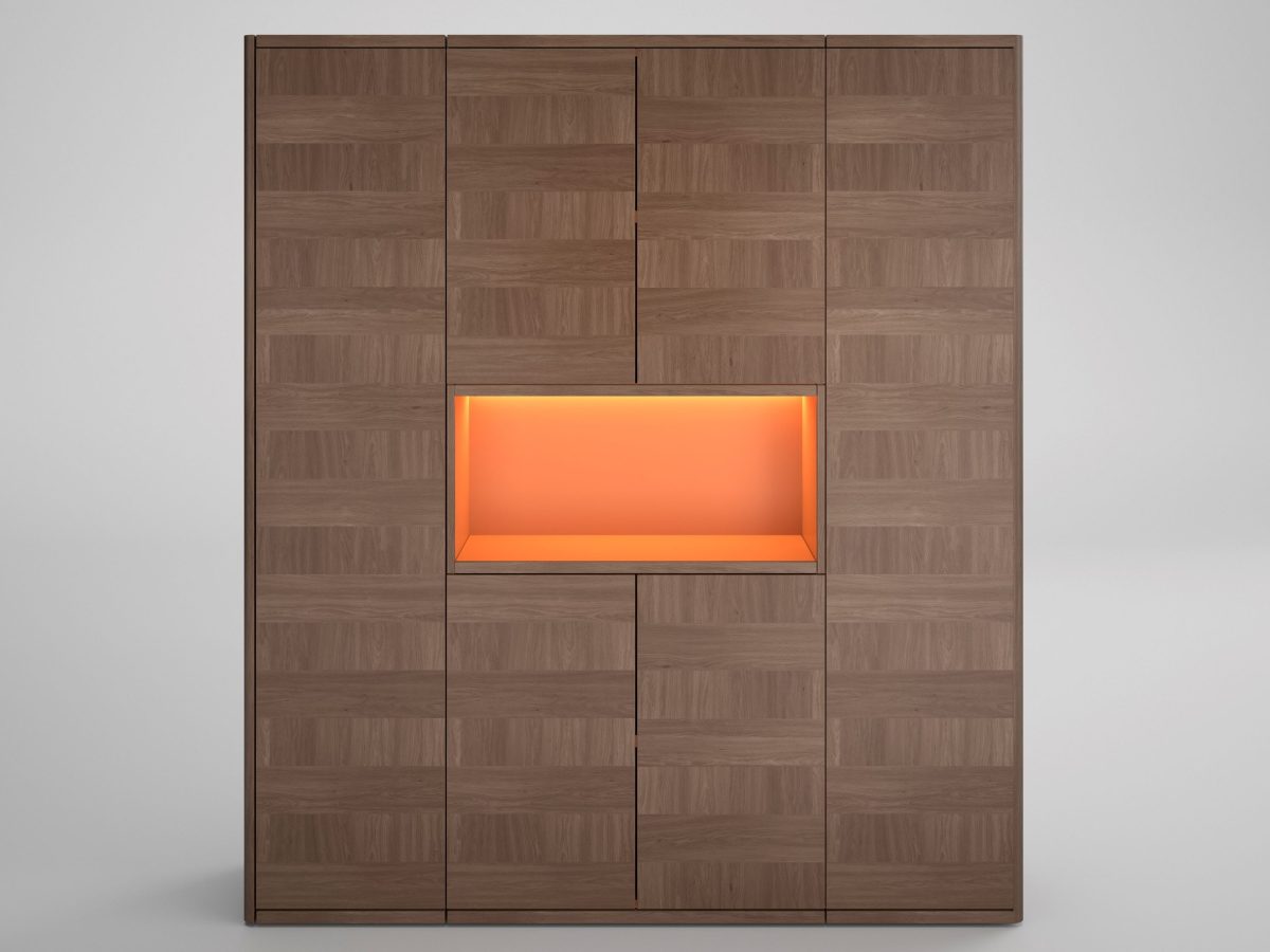 Artdeco is an office storage unit with integrated light in its central part and body made of 20 mm thick 630 kg/m3 MDF fiberboard with 30 mm shelves in natural mukali veneer and 0.5 mm wooden edge. Lacquered in different finishes. Doors made with 20 mm thick MDF board laser cut mukali veneer made with a mosaic-shaped drawing. Combining the different formats of this modular office storage unit, an infinity of different compositions can be achieved.