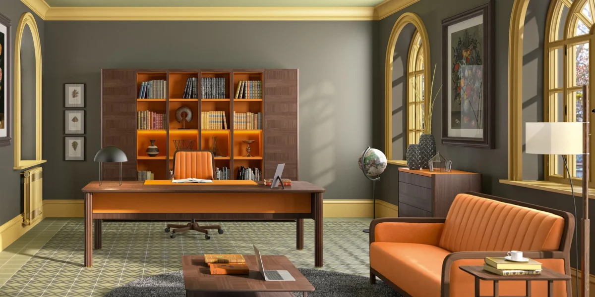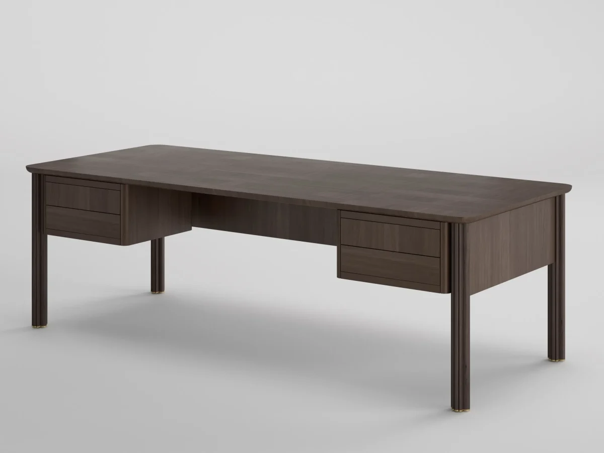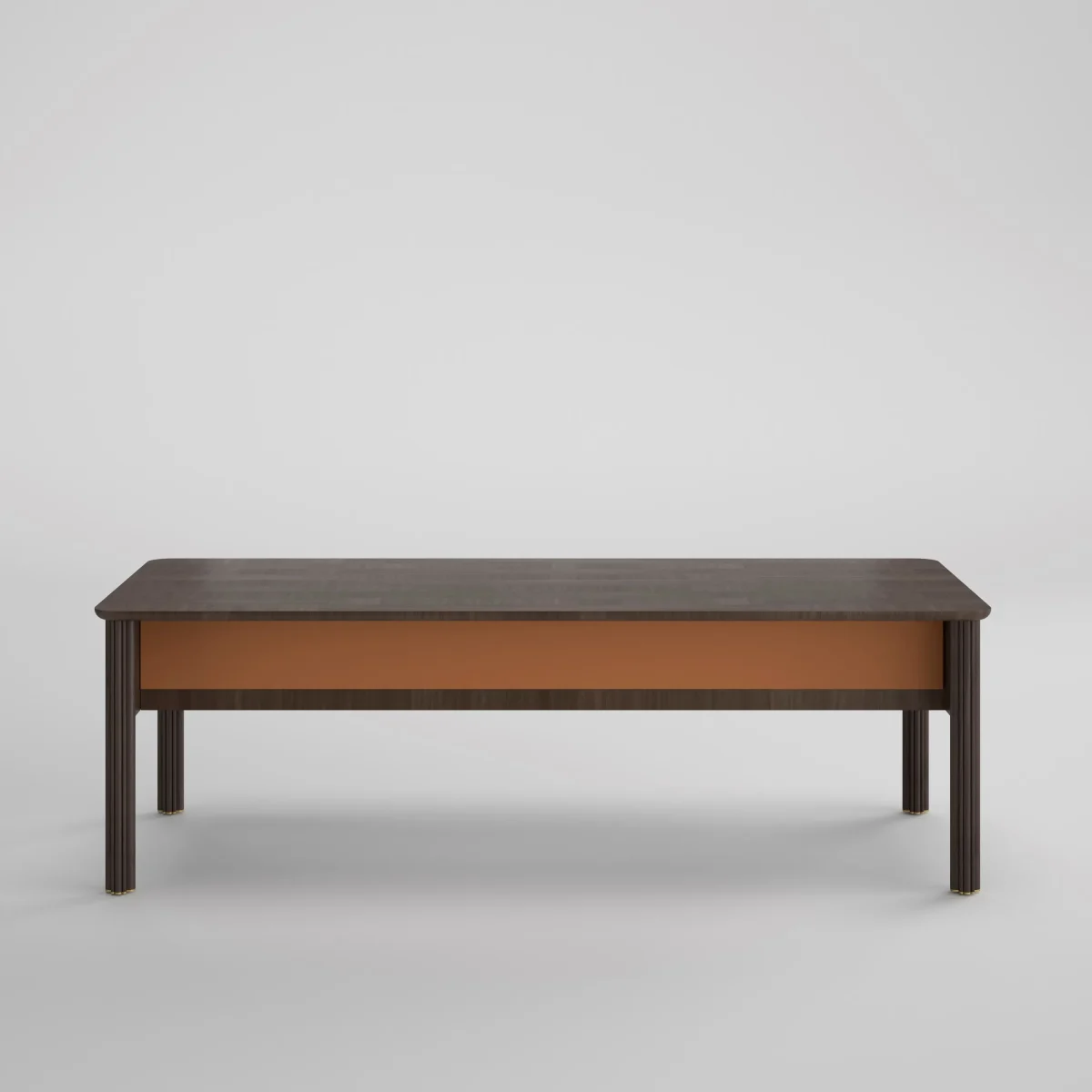 Artdeco is a directional table with optional leather desk pad. Full upholstered modesty panel. Table top is made of 630 kg/m3 30 mm MDF fiber board molded in beech solid wood and laser cut mukali veneer with a mosaic-shaped drawing. The beech edge of the top is rounded. The legs are made of 630 Kg/m3 fiber board in 20 mm thick MDF and natural mukali veneer, rapresented by 4 columns in beech wood in artdeco style. These columns arranged with a hollow for the descent of cables that is practicable thanks to specific magnets in them. On the upper side of the leg there is a small recess between the leg and the top so that it cables can pass to the lower cable tray. Modesty panel of the table is made of fiber board 630 kg/m3 MDF 20 mm thick and mukali veneer, on which another 10 mm 630 kg/m3 MDF board is placed lacquered in different finishes.
