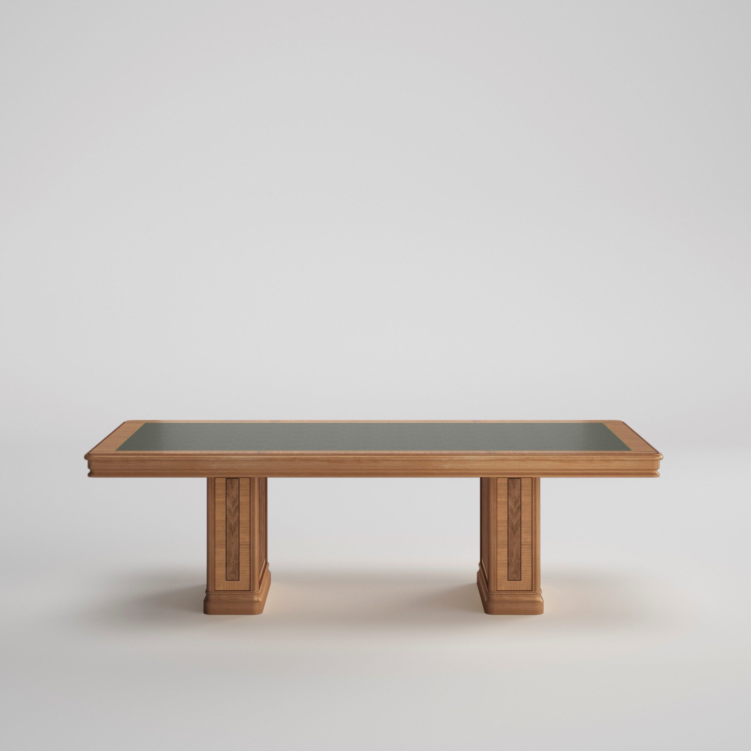 is made in rootwith black stained boxwood veneer marquetry fillet framing the central ash veneer panels. It is available a version with a cover in leather finish, made with a golden fretwork frame framing the insert of leather. Legs made with 19 mm thick chipboard and 0.5 mm thick natural cherry veneer, with black stained boxwood veneer marquetry fillet framing the central ash veneer panels.