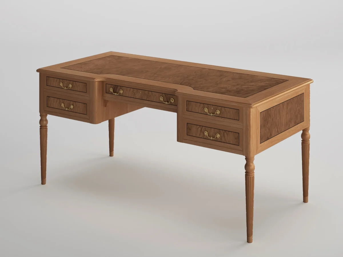 Art&Moble is workstation desk with 2 drawers hanging pedestal and central drawer on the top. Wooden shaped legs. Optional leather on top.