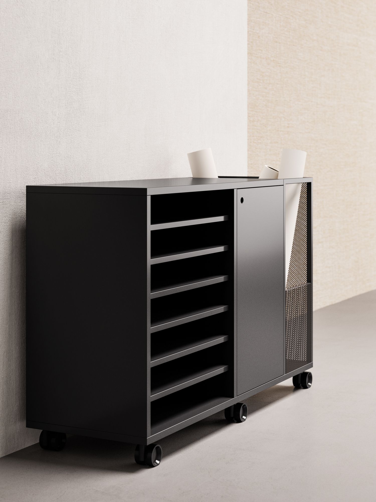 Storage cabinets on wheels (project storage, bins and confidential cabinet) complete the dynamic configuration of ATELIER.