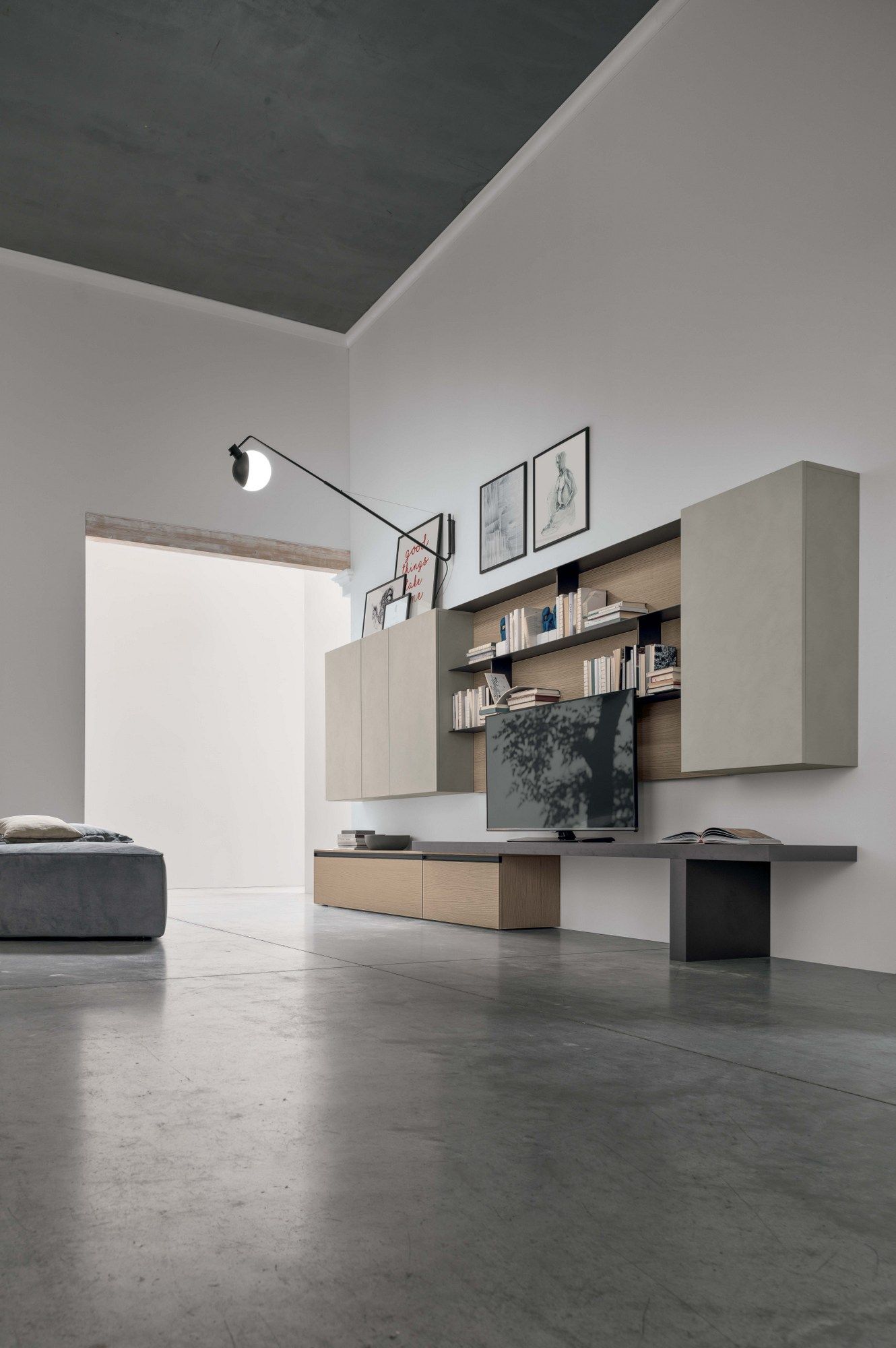 ATLANTE UNIT AT122 – Living composition in textured matt anthracite, textured sand oak, textured cava cement, textured dark cement and anthracite 160 metal.