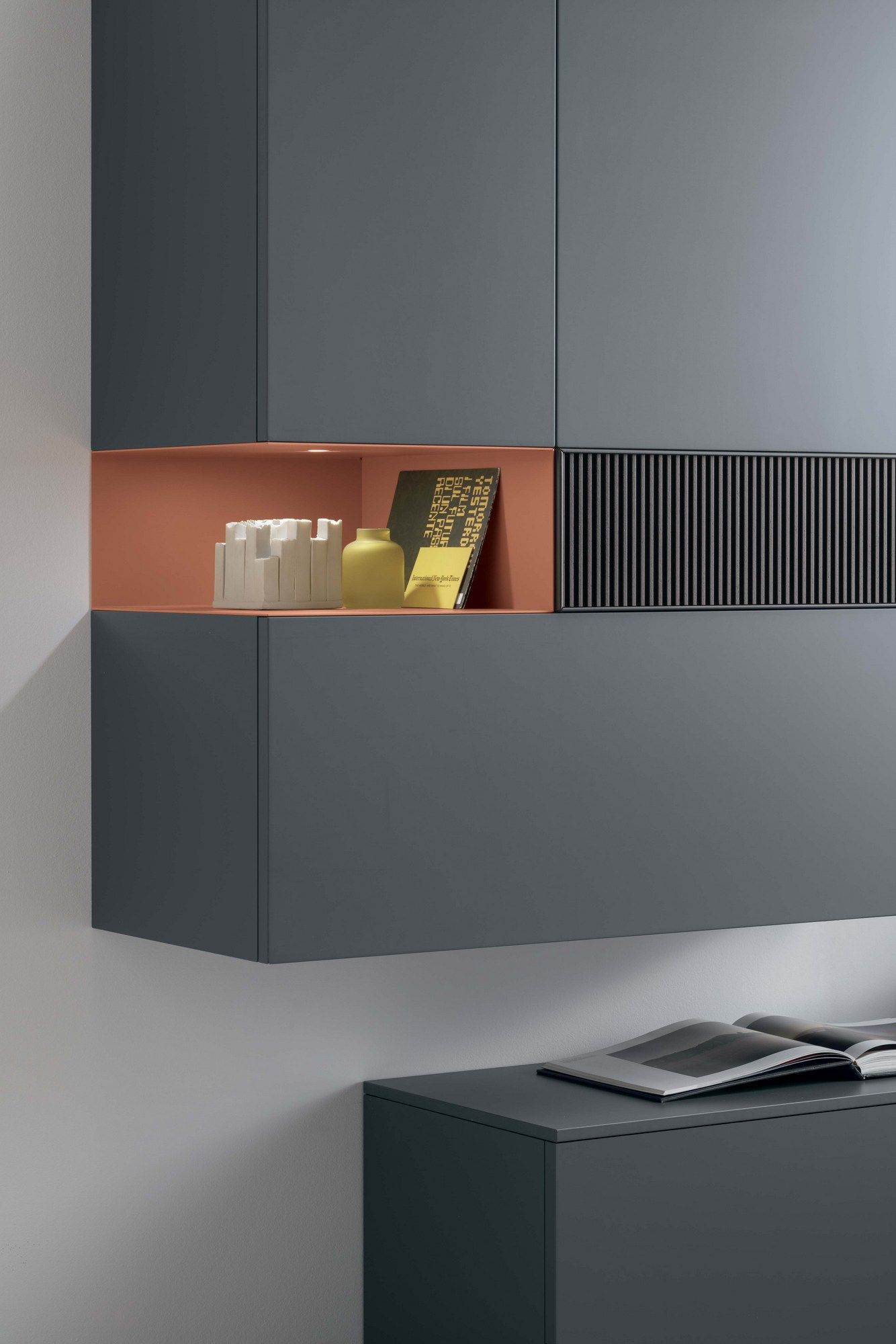 The line of wall units in matt bromine 176 lacquer is interrupted by the Corner alcove in matt tabasco 171 lacquered metal and by a module with a Vinci front in reeded coal oak: a combination of geometries, finishes and colours for a well-balanced yet eye-catching living room