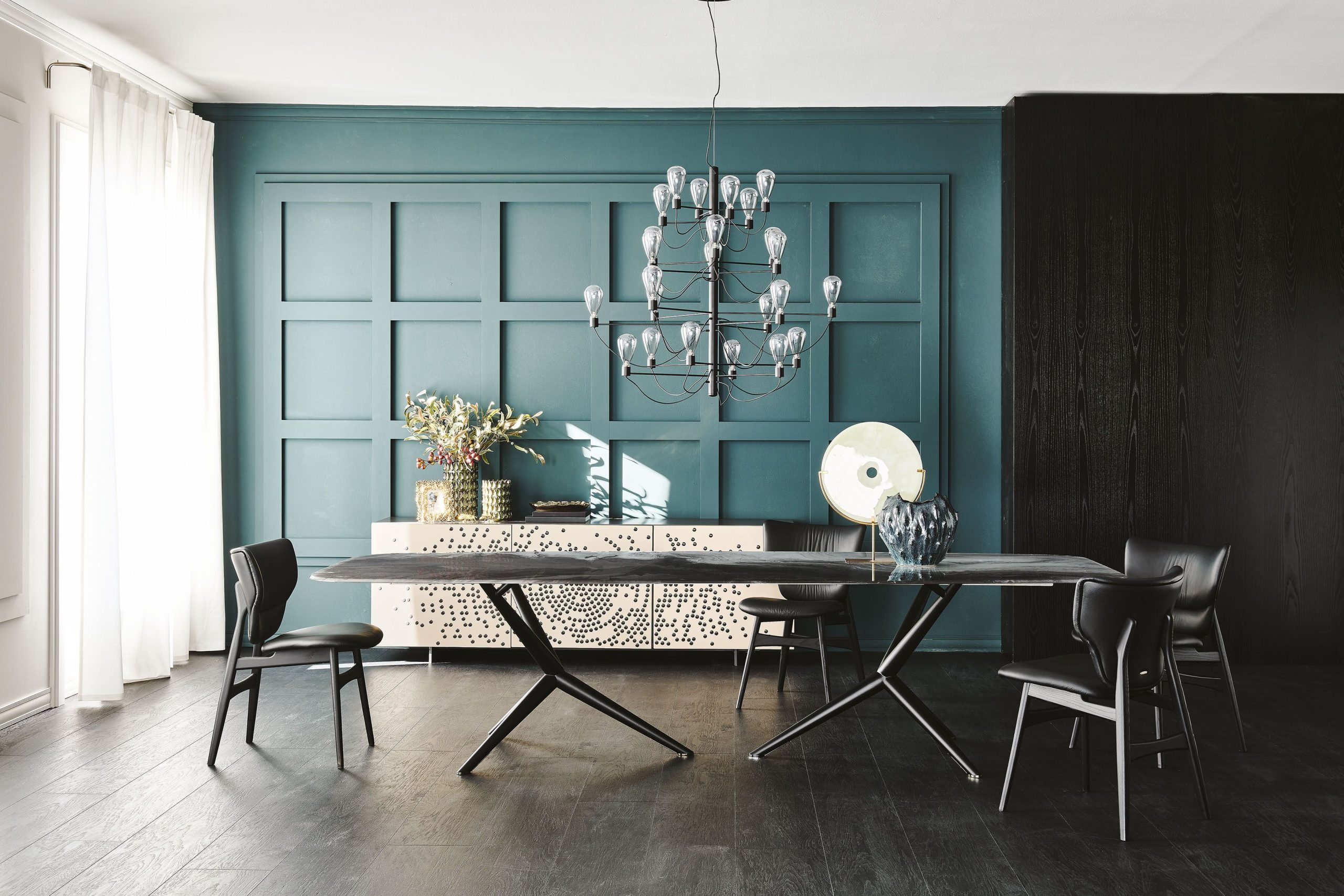 The modern tables in the Atlantis family gives the dining room a refined and inimitable style. A sober stylistic imprint makes this design table a timeless piece of furniture. The slender steel base supports the top in the refined versions available. Atlantis Wood is a wooden table the tops of which can be customised: with irregular edges for a more natural wood effect, with barrel top with beveled edges or with a rounded and painted lower frame. Atlantis Keramik has a sophisticated appearance and is made in many refined shades of Marmi ceramic.Atlantis Crystalart is a glass table with a charming decorative artistic print.