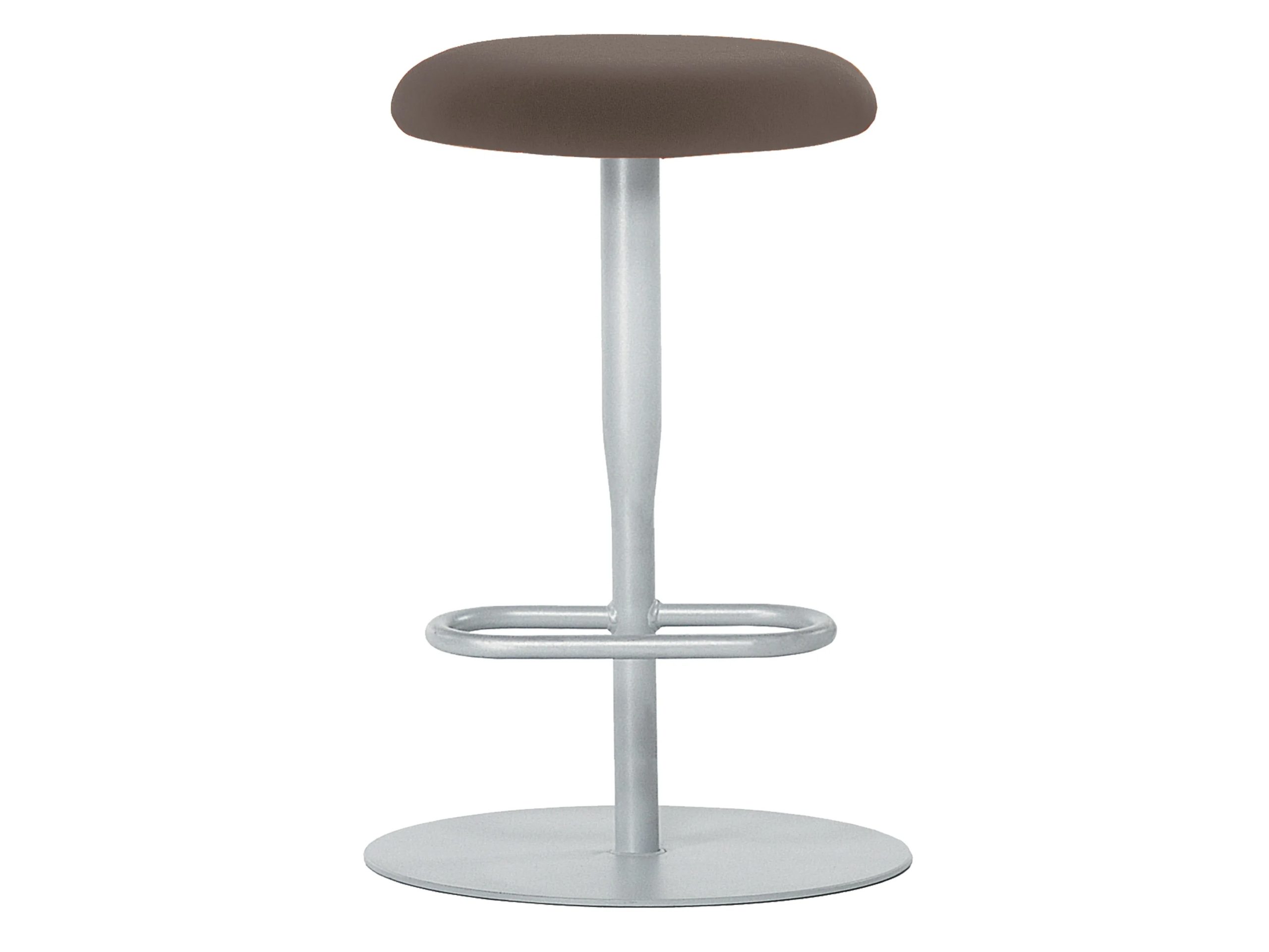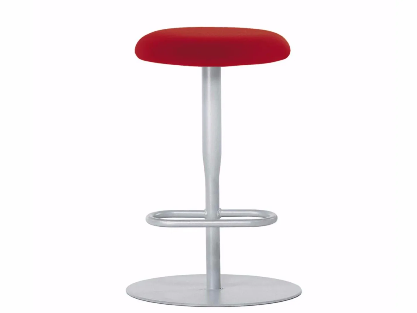 Medium height stool with stove enamelled steel base plate, leg in conic stove enamelled steel, swivel seat in mdf and expanded polyurethane upholstered with fabric.