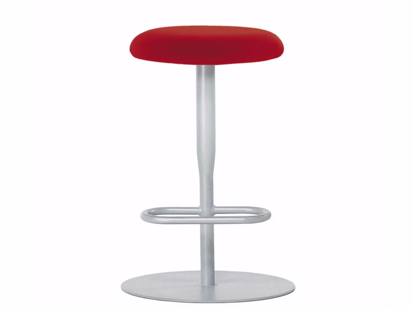 Height adjustable stool with stove enamelled steel base plate, leg in conic stove enamelled steel, swivel seat in mdf and expanded polyurethane upholstered with fabric.