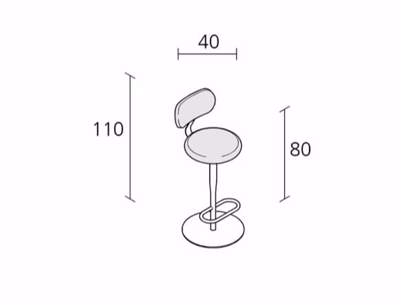 High height stool with stove enamelled steel base plate, leg in conic stove enamelled steel, swivel seat in mdf and back in plywood and expanded polyurethane, upholstered with fabric.