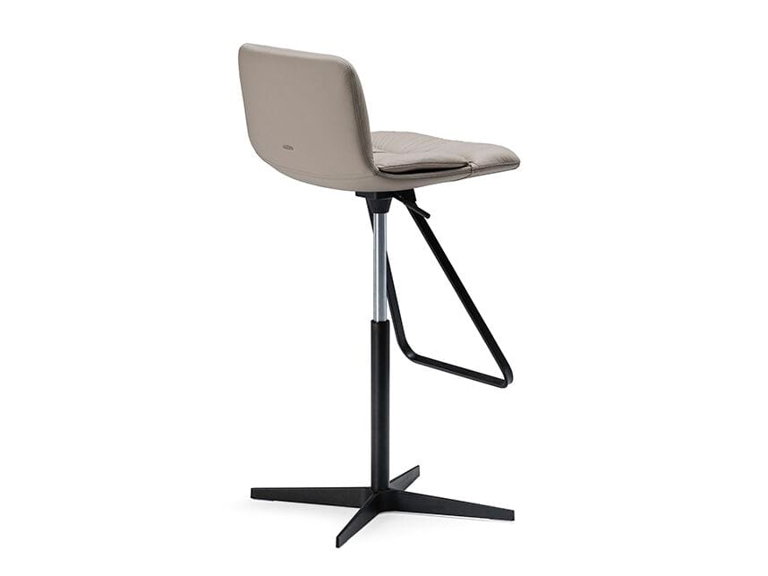 AXEL is a swiveling ultralight stool, adjustable height with 4 spokes base in polished aluminium and column, footrest and gas piston in chromed steel (08) or with base plate, column, and footrest in black (GFM73) or titanium (GFM11) embossed lacquered steel and gas piston in chromed steel (08). Frame covered in fabric, synthetic leather or soft leather as per sample card.
