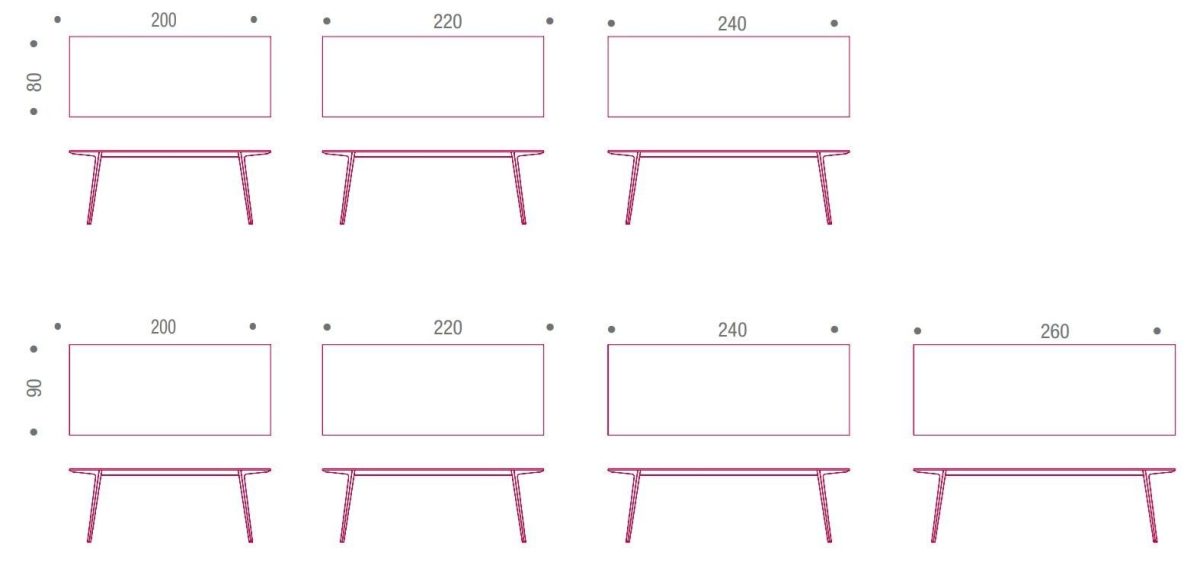 Rectangular tables available in 20 sizes and various depths, height 73cm, in the types and configurations: