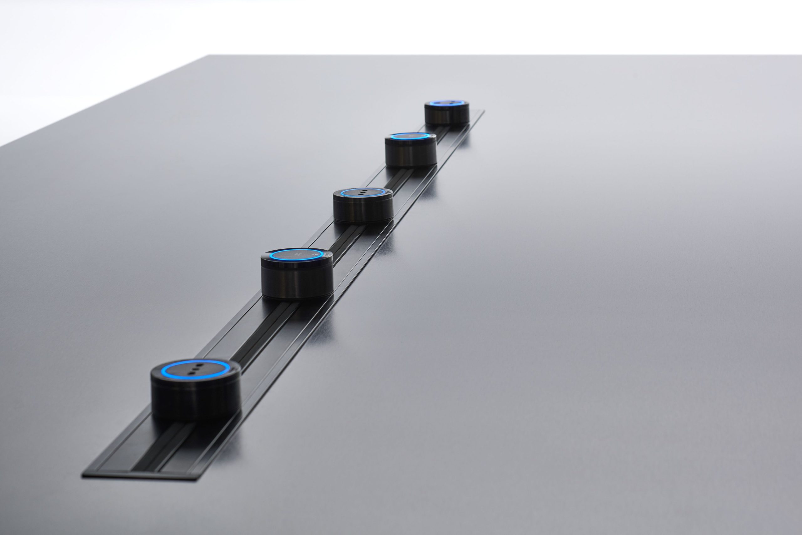 The tables, in the version Axy Comfort D120 L240/260/280/300/340*/400* with tops in Fenix, Wood and Aluminium*, are available in the version with electrified profile. A series of adaptors with different types of sockets and functions can be hooked to the electrified profile. The electrified profile and its components and adaptors are always available in the finish matt black.