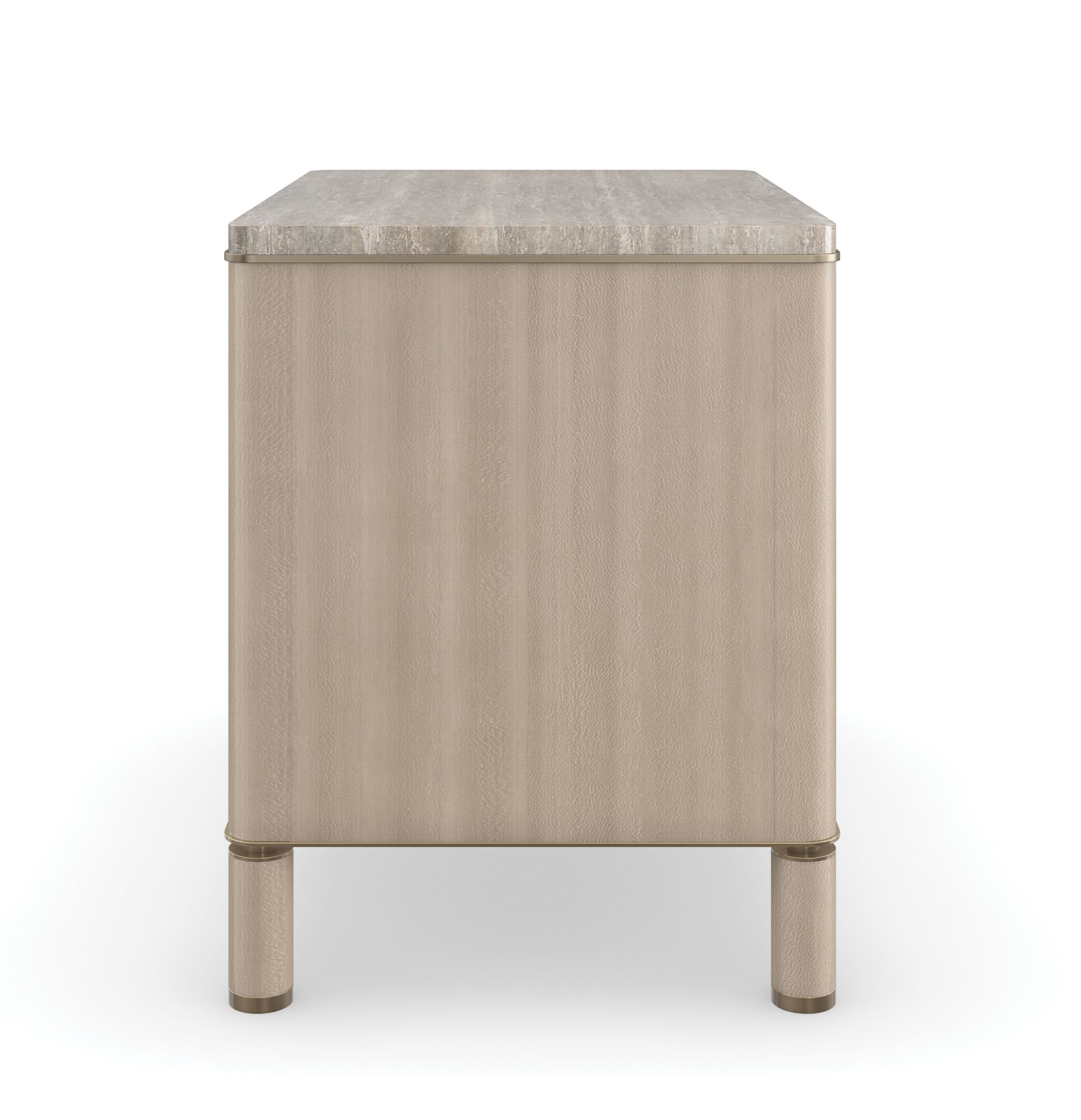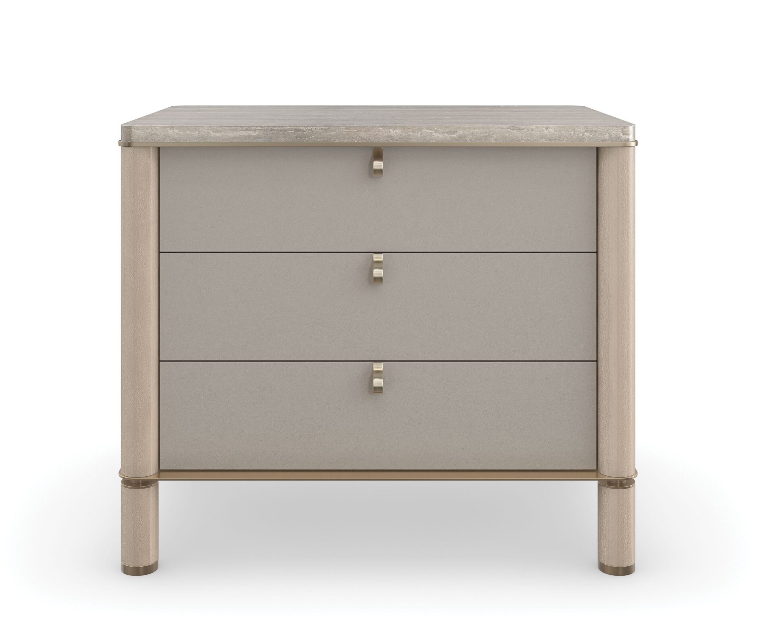 A quietly alluring bedside companion, Balance nightstand exemplifies balance in material and form. Features soft-to-touch, vinyl wrapped drawers, complemented by Silver Platano wood veneers and a polished travertine stone top. Metal accents and a base in Lucent Bronze add warmth and subtle contrast.
