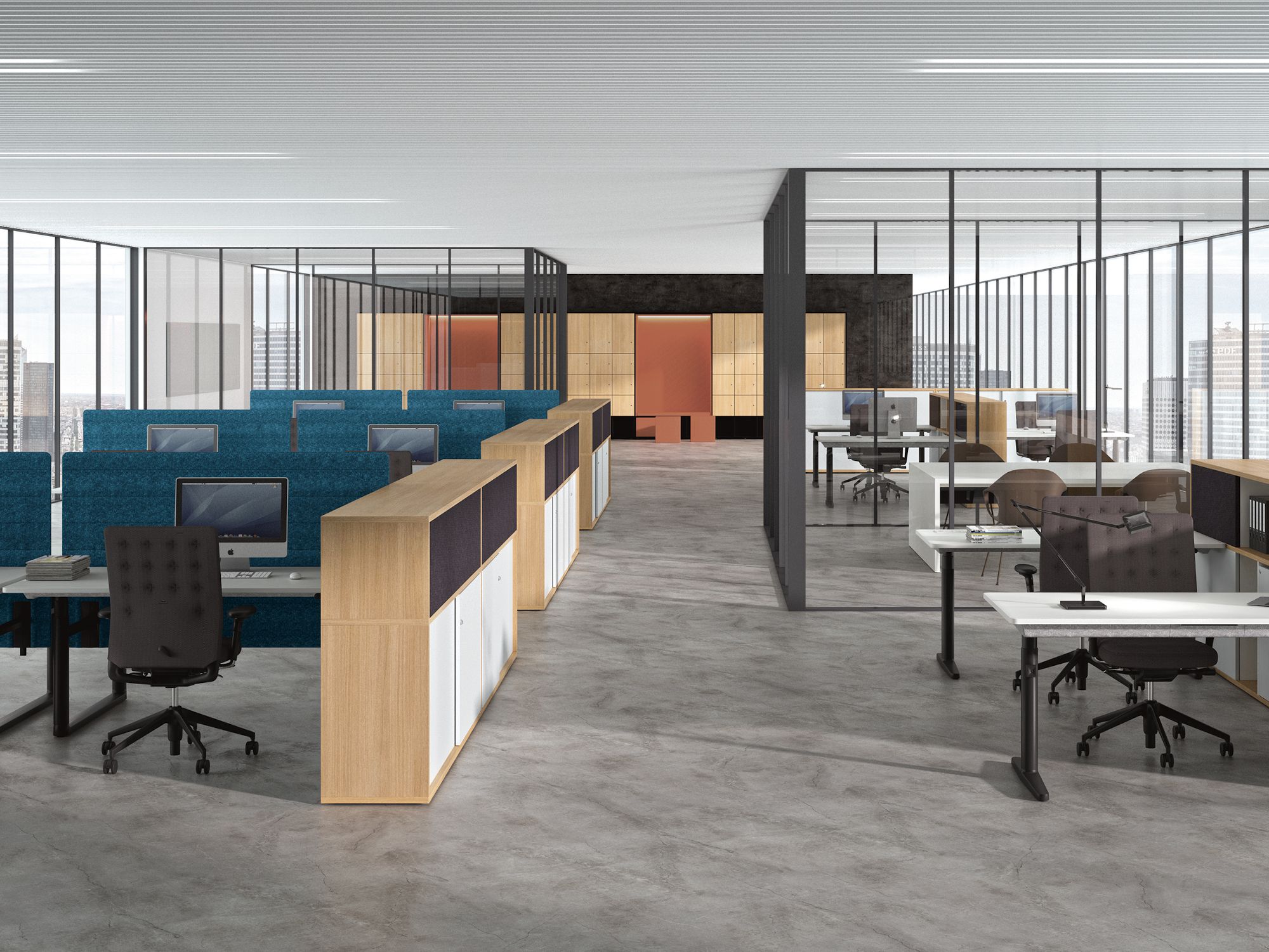 The side cabinets can be used on both sides and provide storage space in the form of drawers, open compartments or behind sliding doors. The choice of single or double-sided shelving units allows the cabinets to be positioned between workstations or as a screen to the aisle zone.The side cabinets can optionally be fitted with sockets to provide charging stations for digital media. In conjunction with the coloured shelving units, the table-high double-sided sliding door cabinets become a structuring element in the room.