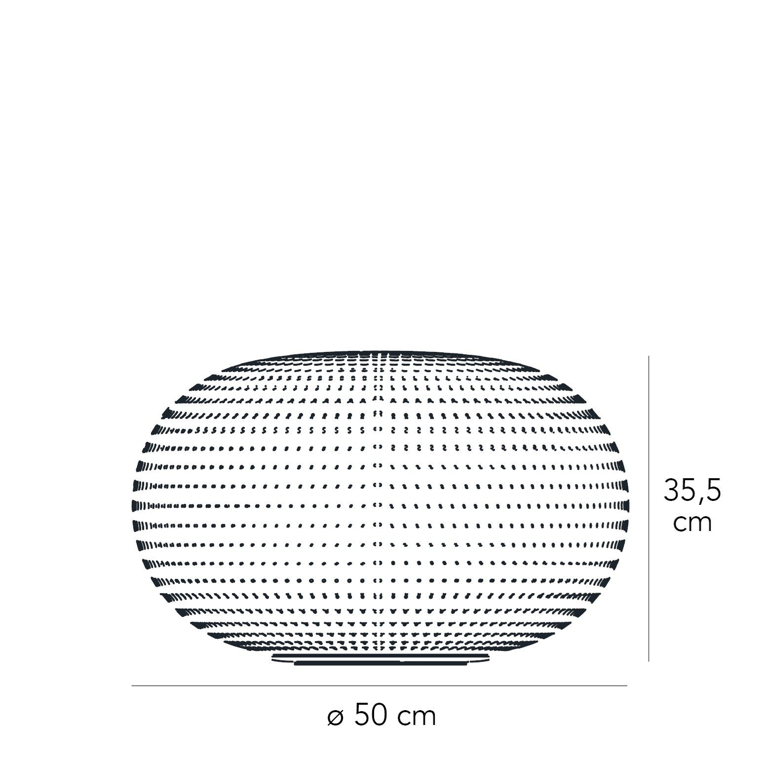 Table lamp with diffused and button-dimmable light. Milk-white diffuser made of blown glass with satin-finish. Painted metal frame. Transparent power cable, dimmer and plug. European two-pole plug. Bulb not included.