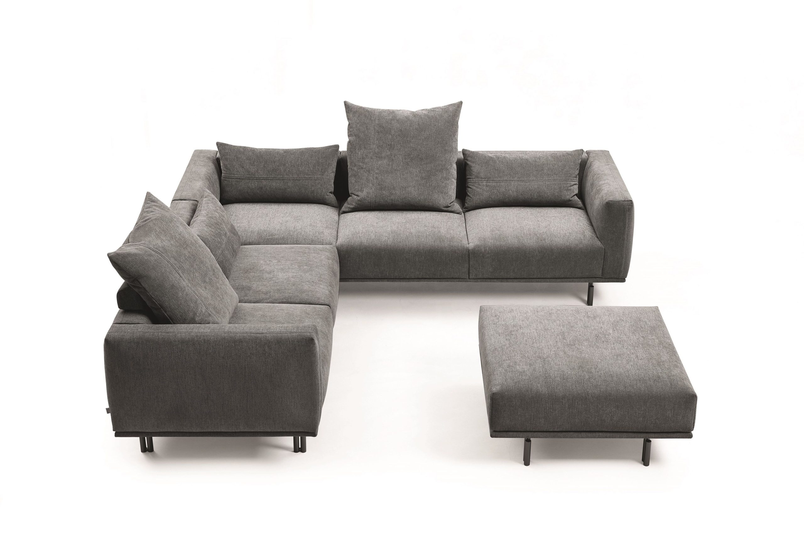 Modular sofa with metal base and padding in non-deformable expanded polyurethane. Structure and cushions with the same fabric or leather covers, in the same colour. Tailoring detail provided by the relief stitching along the perimeter of the armrests.