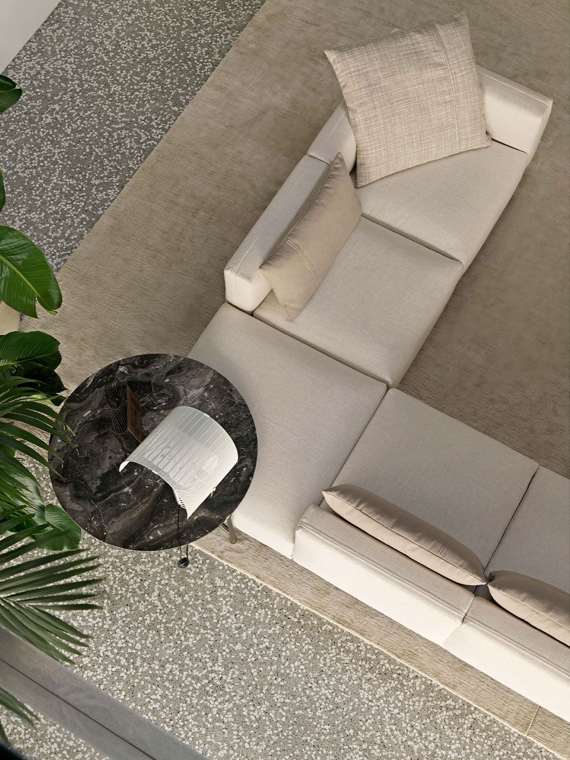 Like the pieces of a jigsaw puzzle, each element is interchangeable: seating and poufs separate, they are assembled and re-assembled to create arrangements that are always new