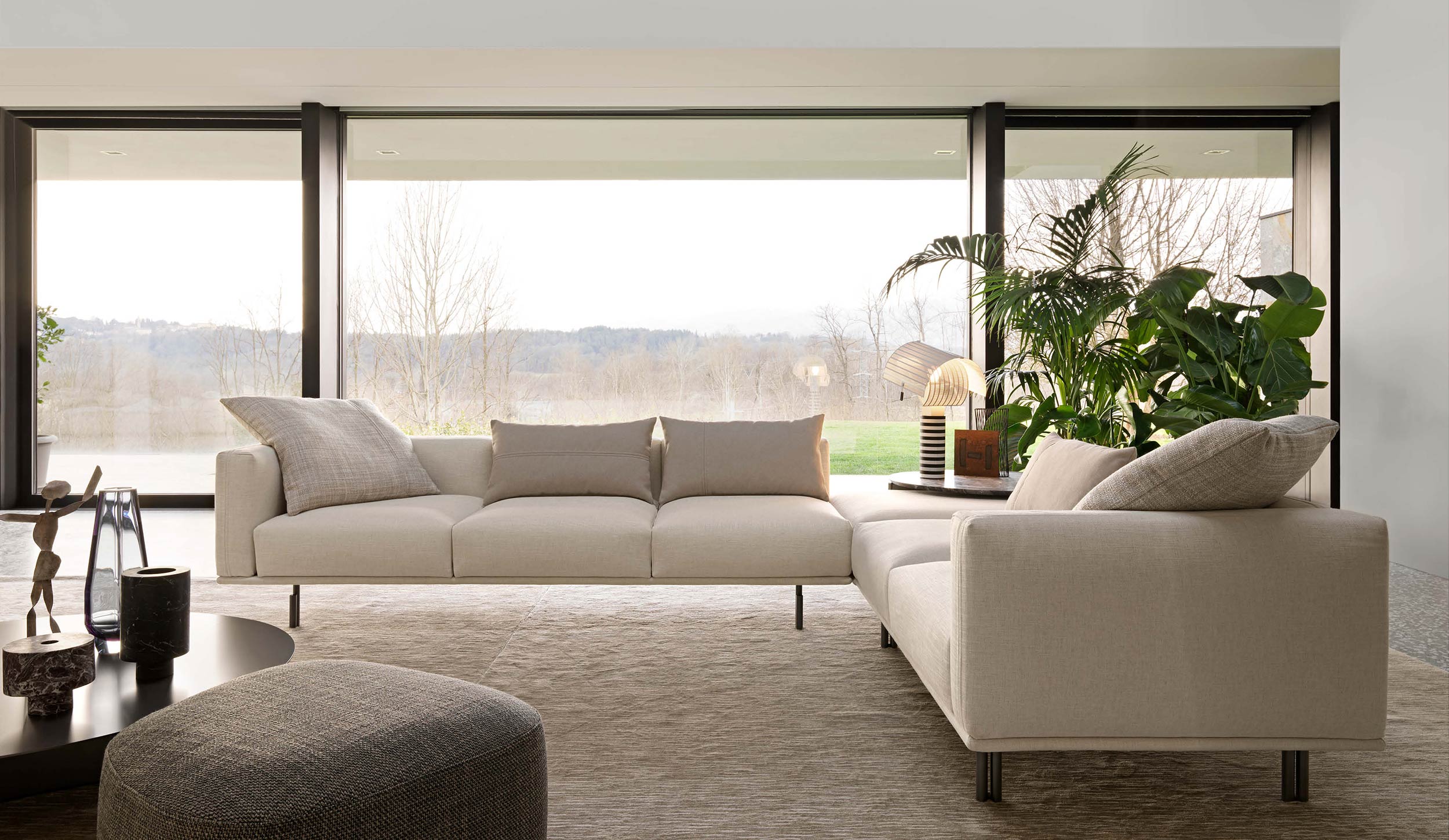 The two- and three-seater sofas are available with one or two armrests and can be arranged as