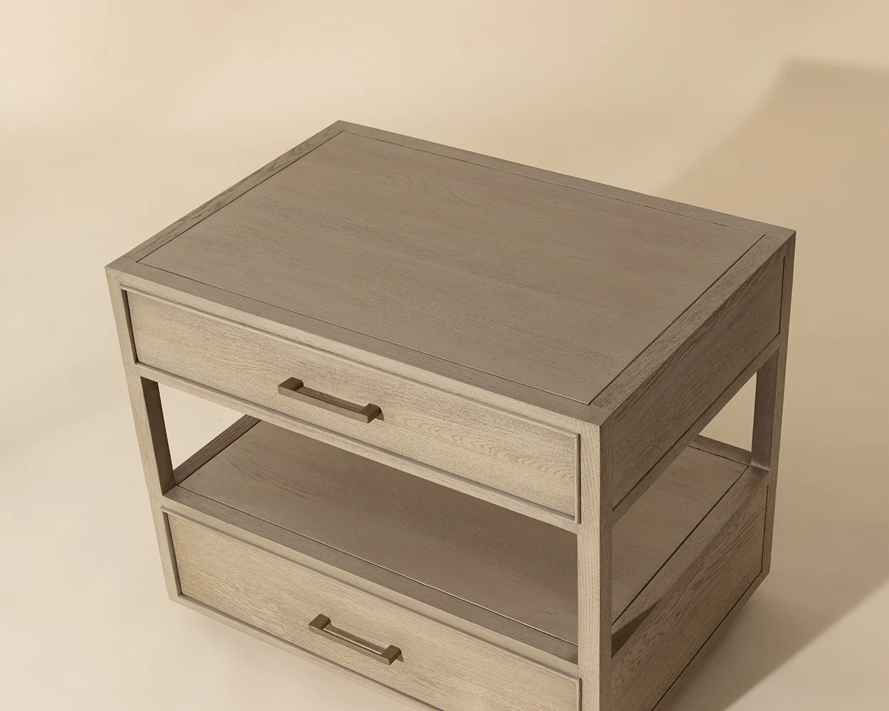 The Bridgerton Nightstand embodies a minimalist profile and clean lines for a mid-century modern bedroom. Fully constructed from oak veneer and solid oak wood with powder-coated iron handles in a champagne gold finish. As wood is an organic, porous material, these pieces will contain natural variation of texture and may also exhibit fine indentations and cracks. Wood pieces will also display a disparity of colour and grain, and visible knots and burls that add to the character of each piece. Made in India. With refined craftsmanship, this design was brought to life by skilled local artisans. Due to the nature of handcraftsmanship, unique imperfections such as fissures, markings and variations in colour and shape are welcomed and appreciated characteristics for a truly one-of-a-kind piece.