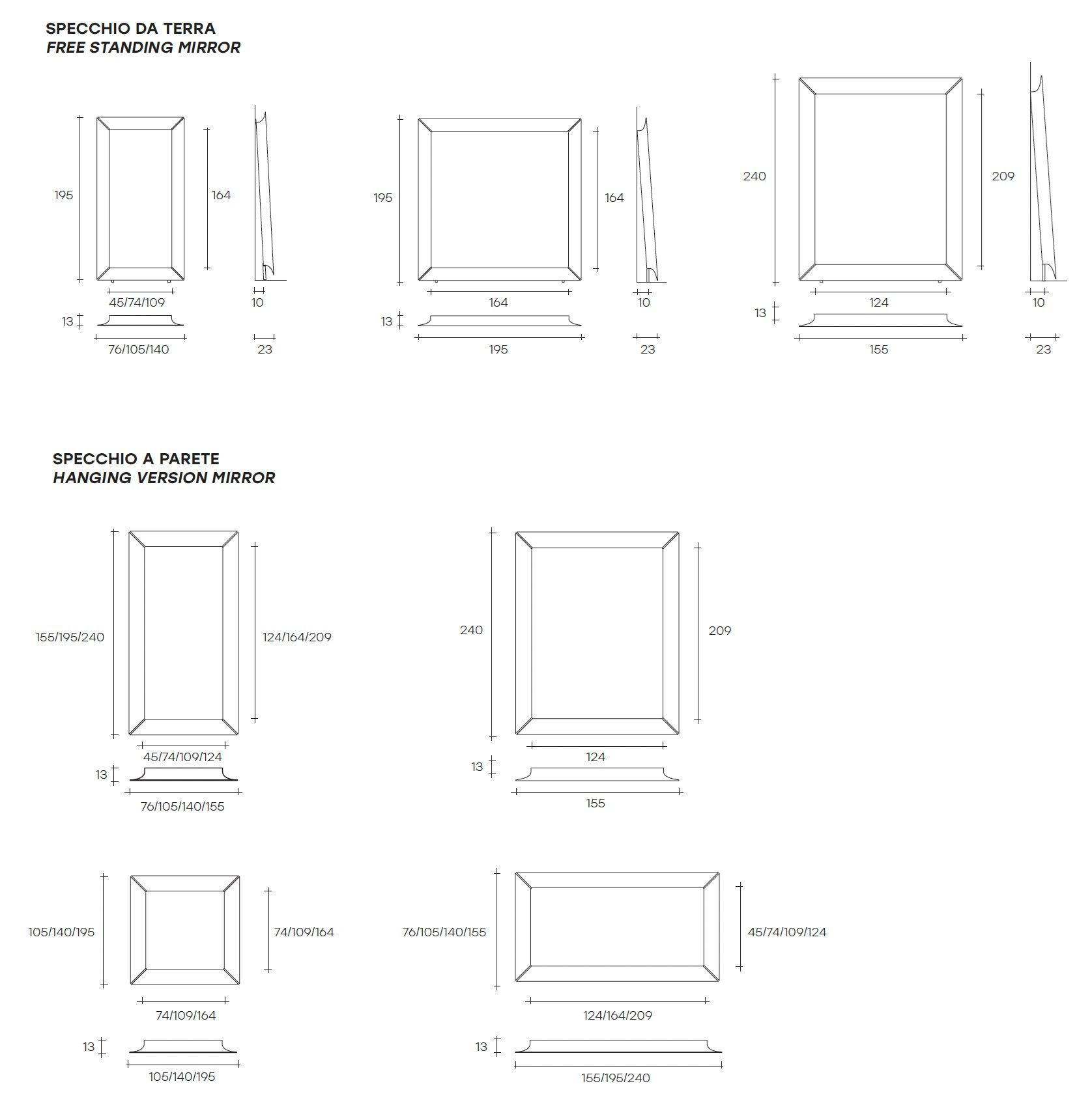 Caadre is a free-standing mirror, also available in hanging version in 6 mm-thick curved glass, made of four separate back-silvered curved elements. Also available in semi-reflective titanium glass or in bronze glass back-silvered. It can be hung horizontally or vertically. Also available custom-sized and in modular configurations. LED lighting kit with a dimmer switch and temperature regulation (optional).