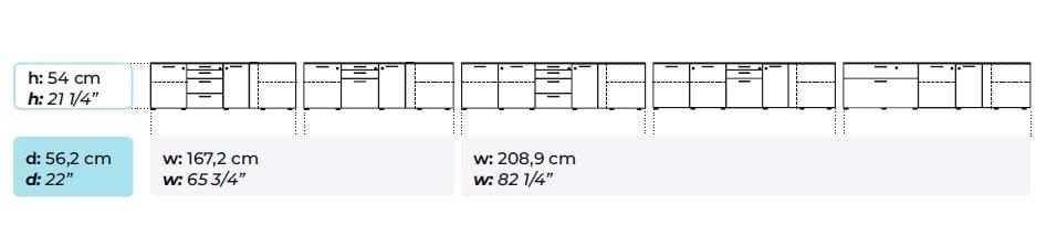 Low office furniture made of melamine with hinged doors and drawers. Equipped with a soft closing system, a stationery drawer, a lock and wheels.