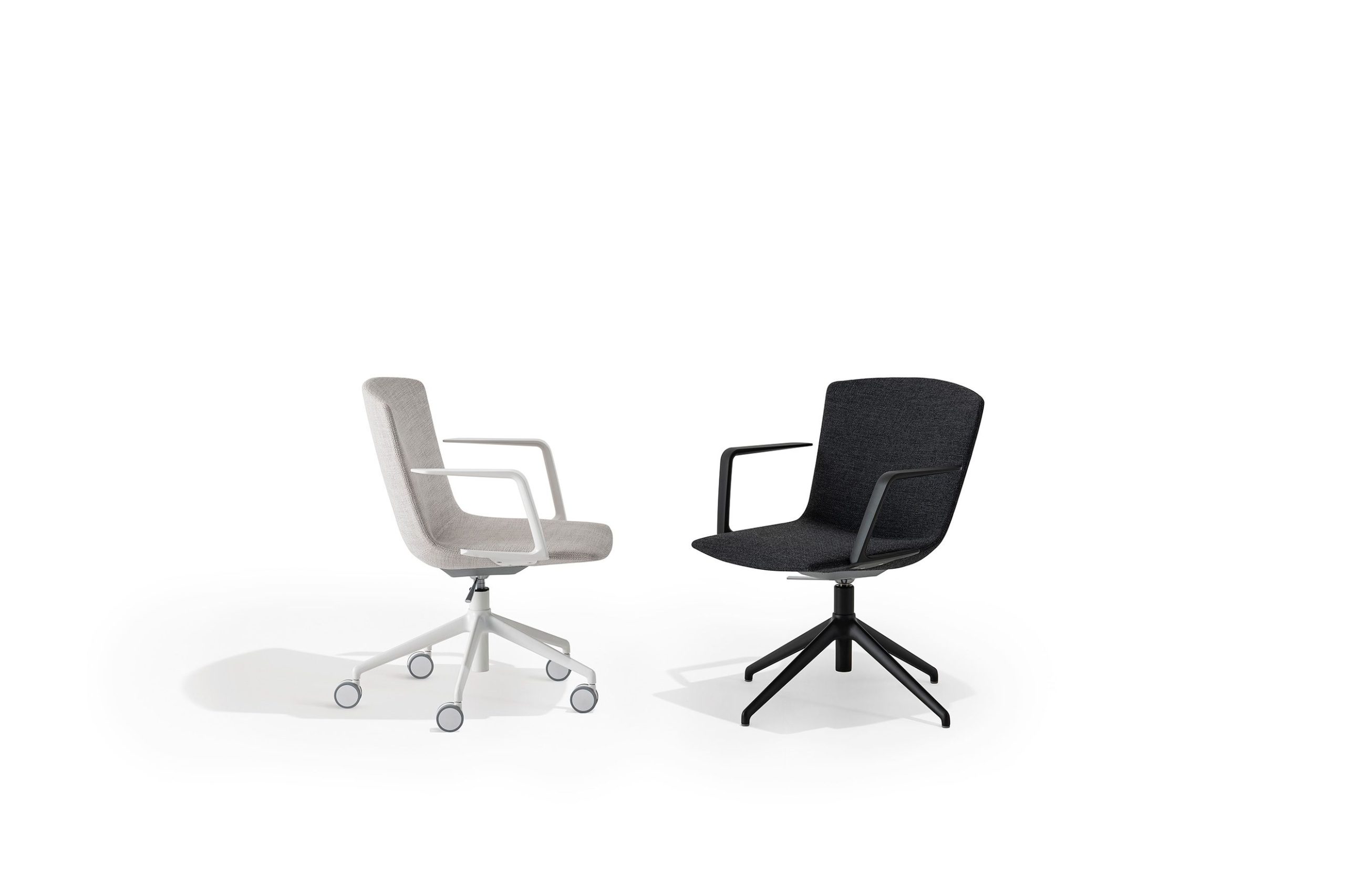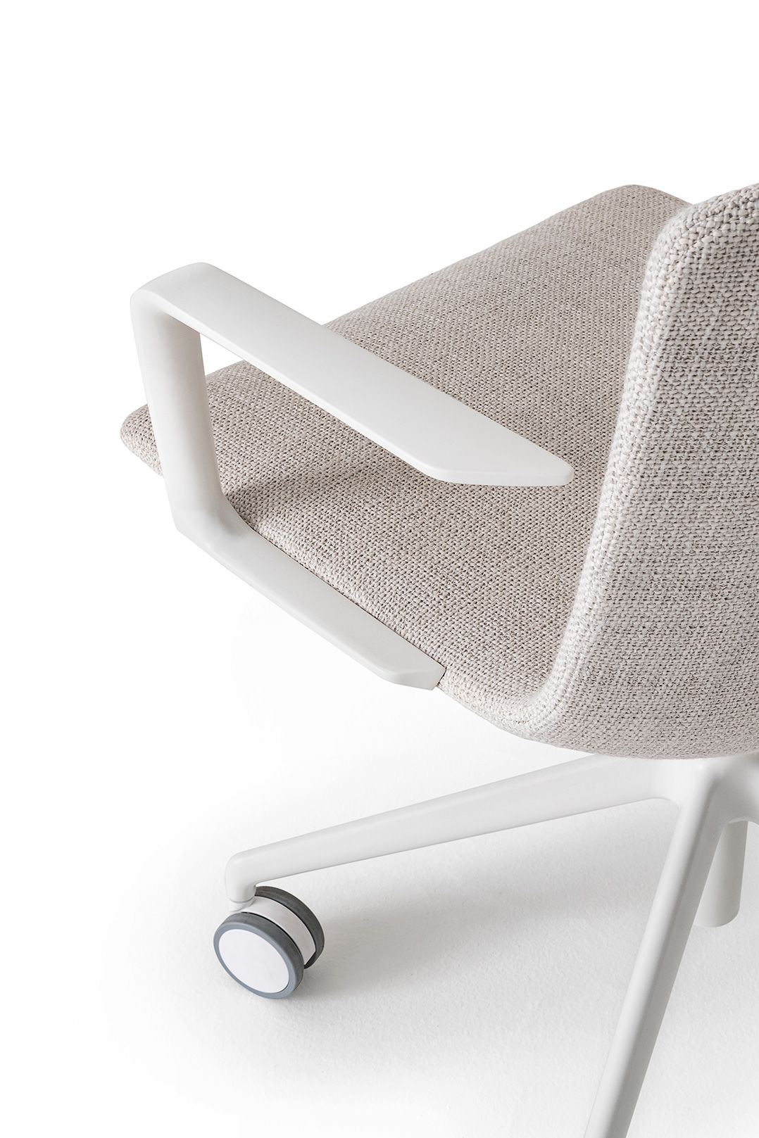 Family of office chairs with seat in rigid polyurethane and foam padding. Armrests in molded aluminum or padded in polyurethane with internal steel structure. Swivel base in aluminum equipped with mechanism for adjusting the height and seat inclination , with 4-star or 5-star base, self-braking wheels.