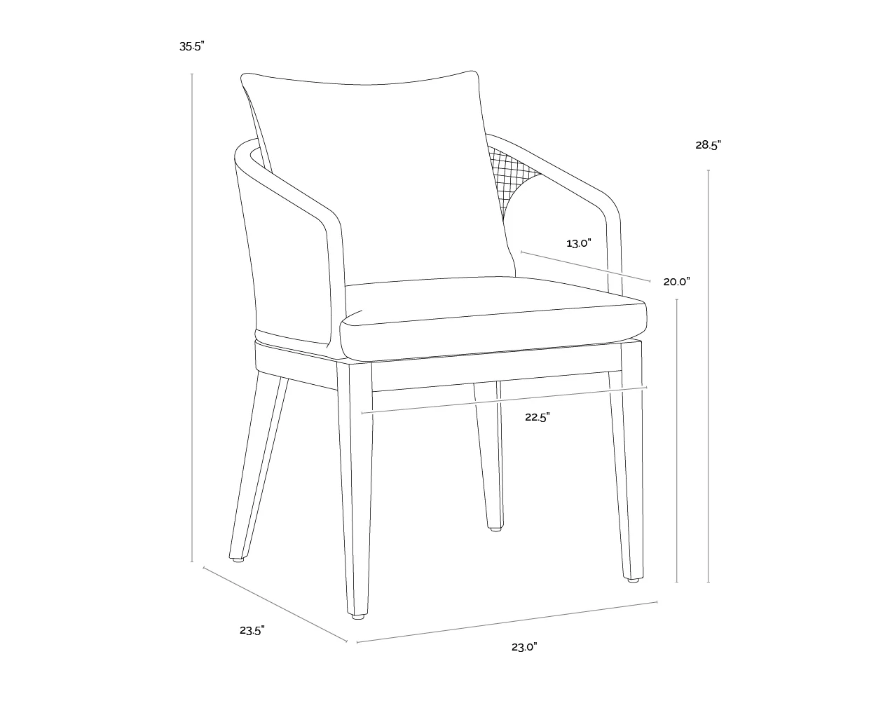 Blur the lines of inside and out with this beautiful outdoor dining chair. This comfortable design features a barrel back frame wrapped in greymix weave and seat cushions in palazzo cream fabric. A drift brown teak wood base completes the look. Suitable for indoor and covered outdoor spaces. Features & Benefits Designed to bring indoor comfort outdoors, this frame is inspired by our bestselling Cornella Dining Armchair. Crafted with premium SVLK-certified Grade-A teak wood sourced from responsibly managed forests in Indonesia. Teak wood is durable and will develop a silver-grey finish over time. The natural oils in teak help prevent rotting and offer resistance to fungus, termites, and wood-boring pests. Teak oils may surface when exposed to rain and humidity, appearing as water stains. These oils can leave teak marks on fabrics and are easy to clean. Fine cracks are natural and may occur as the wood ages. Powder-coating on the aluminum frame adds resistance to corrosion and weather hazards. Synthetic all-weather rope weave is fade resistant and easy to clean. Textilene mesh cushion construction is stretch and tear resistant. Durable quick dry foam cushions are anti-microbial and environmentally friendly. PVC-coated olefin outdoor performance fabric offers extreme weather resistance and protection against fading and UV damage. Oeko-tex certified outdoor performance fabric is free of substances that are harmful to humans and our larger ecosystems. Crafted with 100% recyclable materials. Apply protective covers or store indoors when not in use and during inclement weather to prolong the life of outdoor furniture.