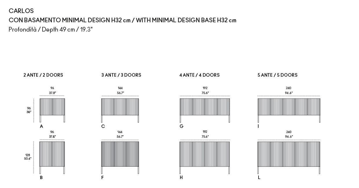 Structure made from particleboard, melamine-coated and lacquered. The thickness of the structure and shelves is 18 mm, the back panel 10 mm, and the fixed central divider 36 mm. Door panels of hardboard or plywood, veneered with heat-treated oak, machined vertically to accommodate vertical inserts made of white, full-colour laminates. Shelves made from transparent tempered glass, with polished edge, 5 mm thick. PVC or felt bumpers. Painted ABS adjustable feet with aluminium finish. Optional base, height 16 cm or 32 cm, made from powder-coated iron. Optional accessories: shelf for glasses, extractable cutlery box, extractable tray, wooden shelves.