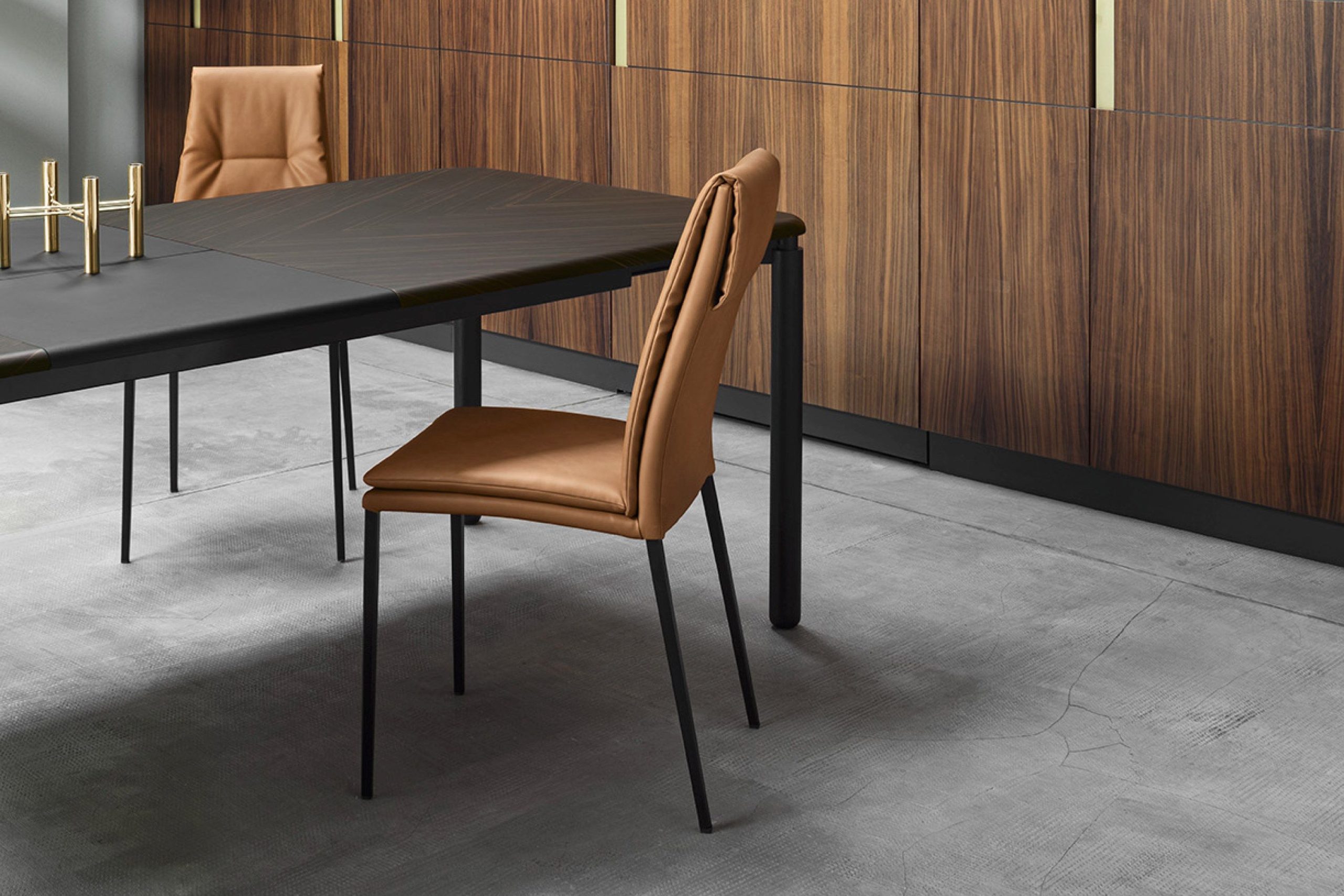 Carmen has a grace and elegance all of its own. The 4 sturdy yet slender metal legs bespeak its refined minimalist soul while the seat, which has a singularly harmonious silhouette, has been made softer and more comfortable thanks to the padding and attached cushion. The chair as a whole has been designed to impart visual harmony: “form” and “function” are one. Upholstered chair with metal frame-