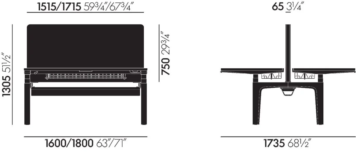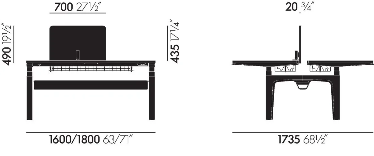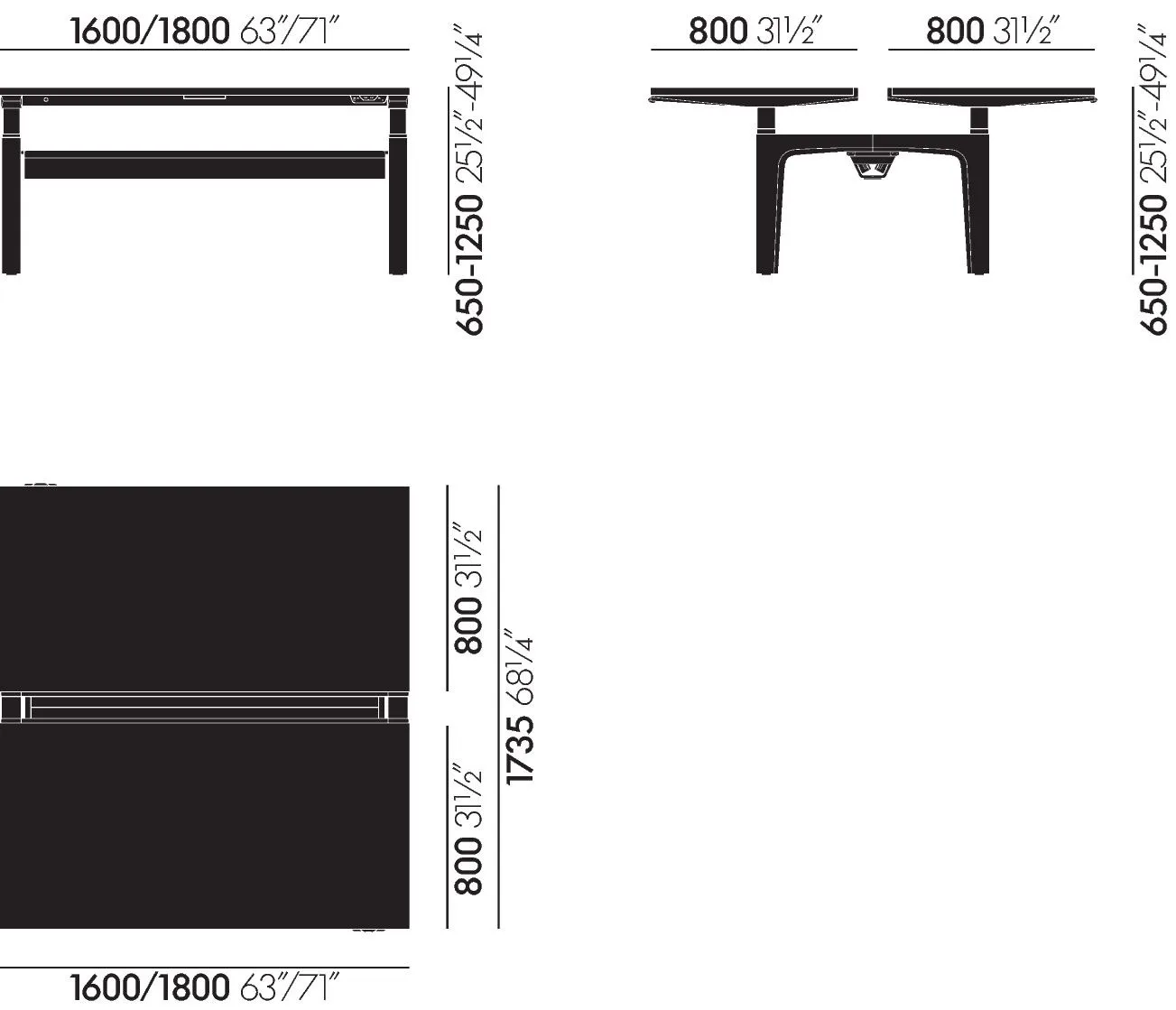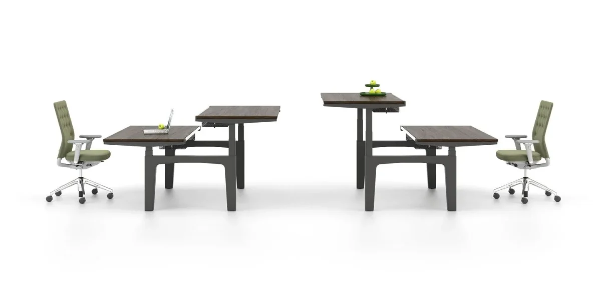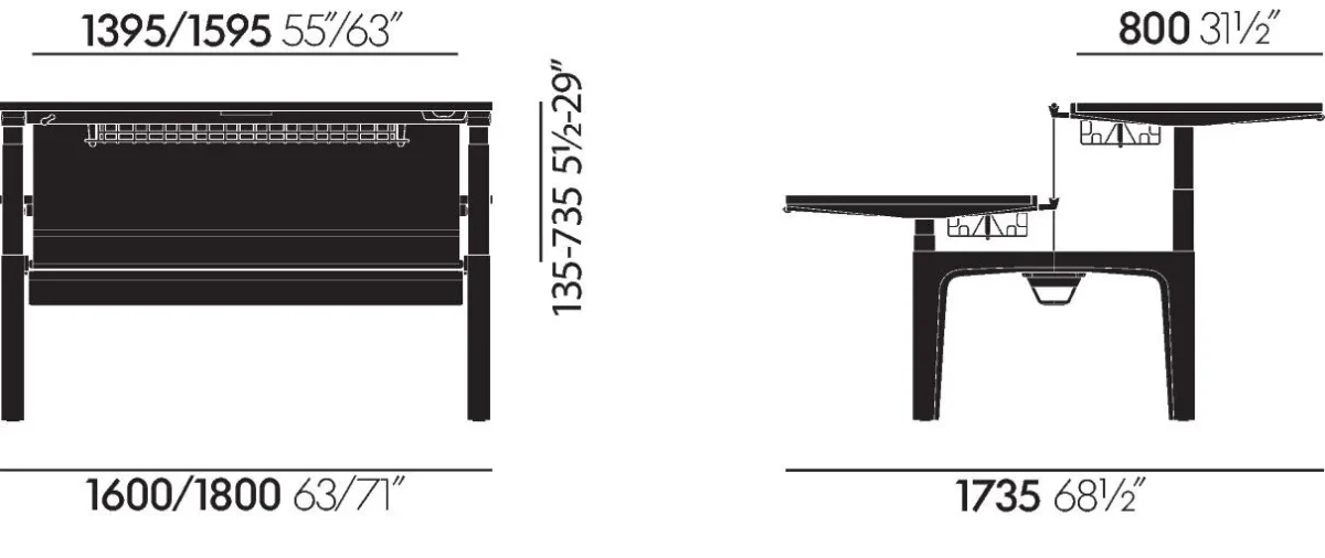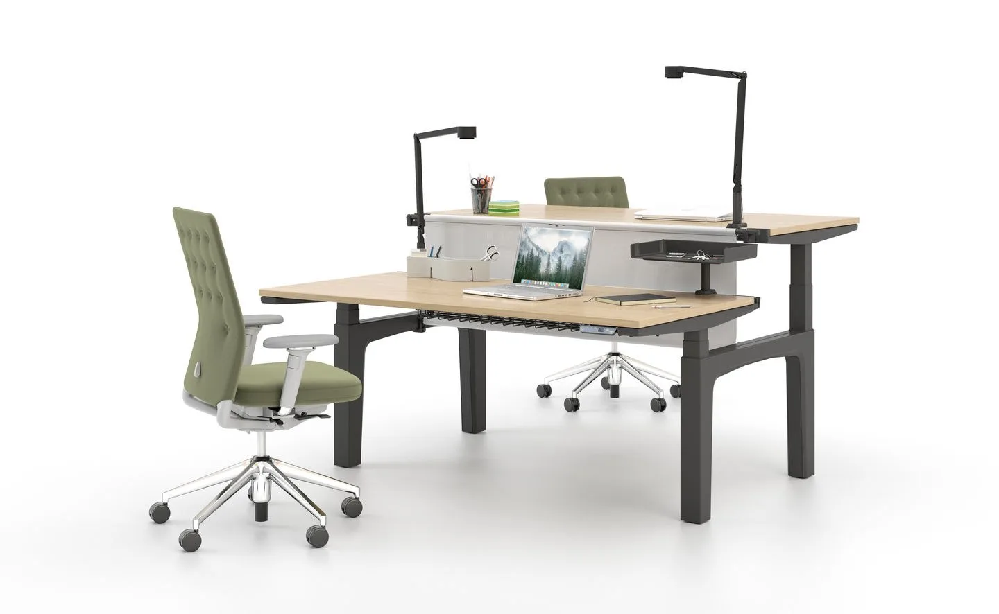 The authentic industrial aesthetic of CDS conveys the character of a system founded on technical solutions. This impression is underscored by its structural details. The most practical approach was taken for each function. Easily accessible power options, cable baskets and cable guides keep work areas tidy, while privacy is ensured by the screens and the cleverly designed roller blinds, which are automatically supported by the higher of the table tops when raising or lowering the tables. In addition, discreet technical rails flush with the work surface can be fitted with desktop monitor and lamp holders, as well as containers and accessories, without the need for any tools.