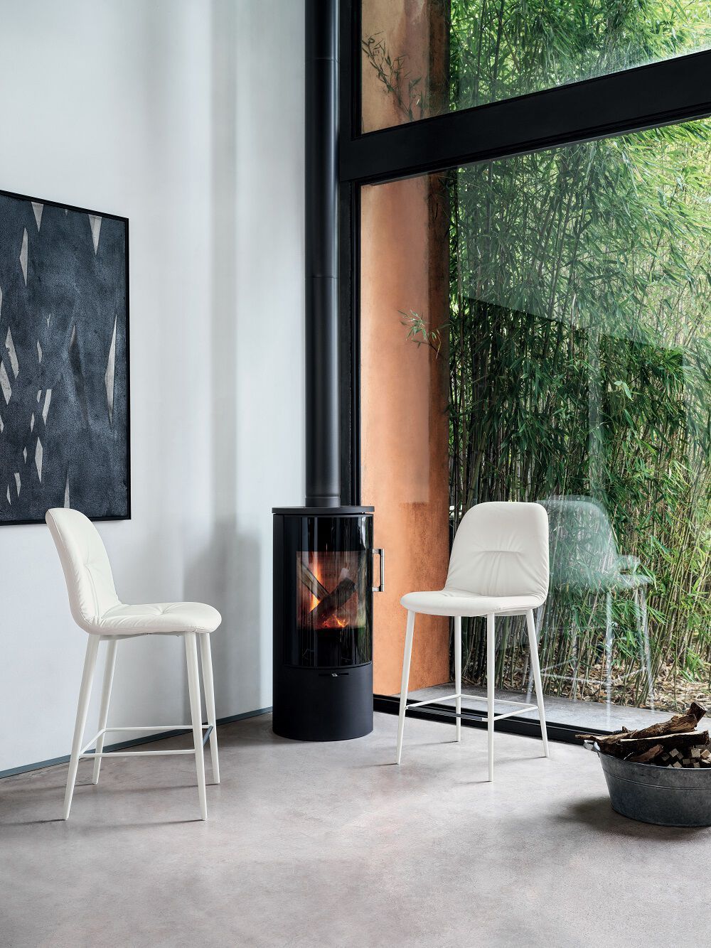 CHANTAL is a swivel barstool with chrome metal frame, gas lift piston and height adjustable, seat and back upholstered and covered in Premium Eco leather, Bouquet fabric, Gourmet fabric, Nordic fabric, Pure Virgin Wool, Supreme Velvet and Premium Nappa Leather.