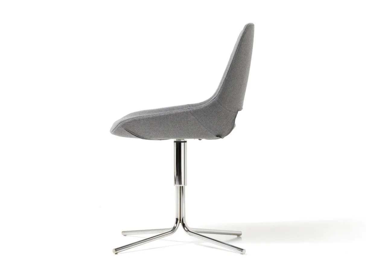 Clea is a curvy shell with inner steel structure and padding in cold polyurethane foam. Available on various bases: 5-spur aluminum with swivel, gas lift and rubber wheels; 4 aluminum blades with automatic return mechanism; 4 tubular steel spokes with swivel; chromed sled; black or white lacquered pyramid.