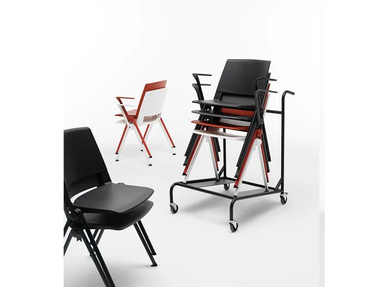 CLIO PLASTIC is a collection of seats for waiting and collective spaces. It is composed of polypropylene seat and backrest in four colours: white, black, red and anthracite. The base is available with four legs in polished tubular steel or painted in the colours of the shells and black polypropylene feet or swivel with fixed plate, gas lift and braked swivel castors. The armrests are fixed and offered in two versions: a polypropylene “cantilever” in the four polypropylene colours and a polished or black die-cast aluminium “ring” with swivel white or black pad. The chair is equipped with a folding tablet, reciprocal hooks for in-line compositions, under-seat baskets and trolley.