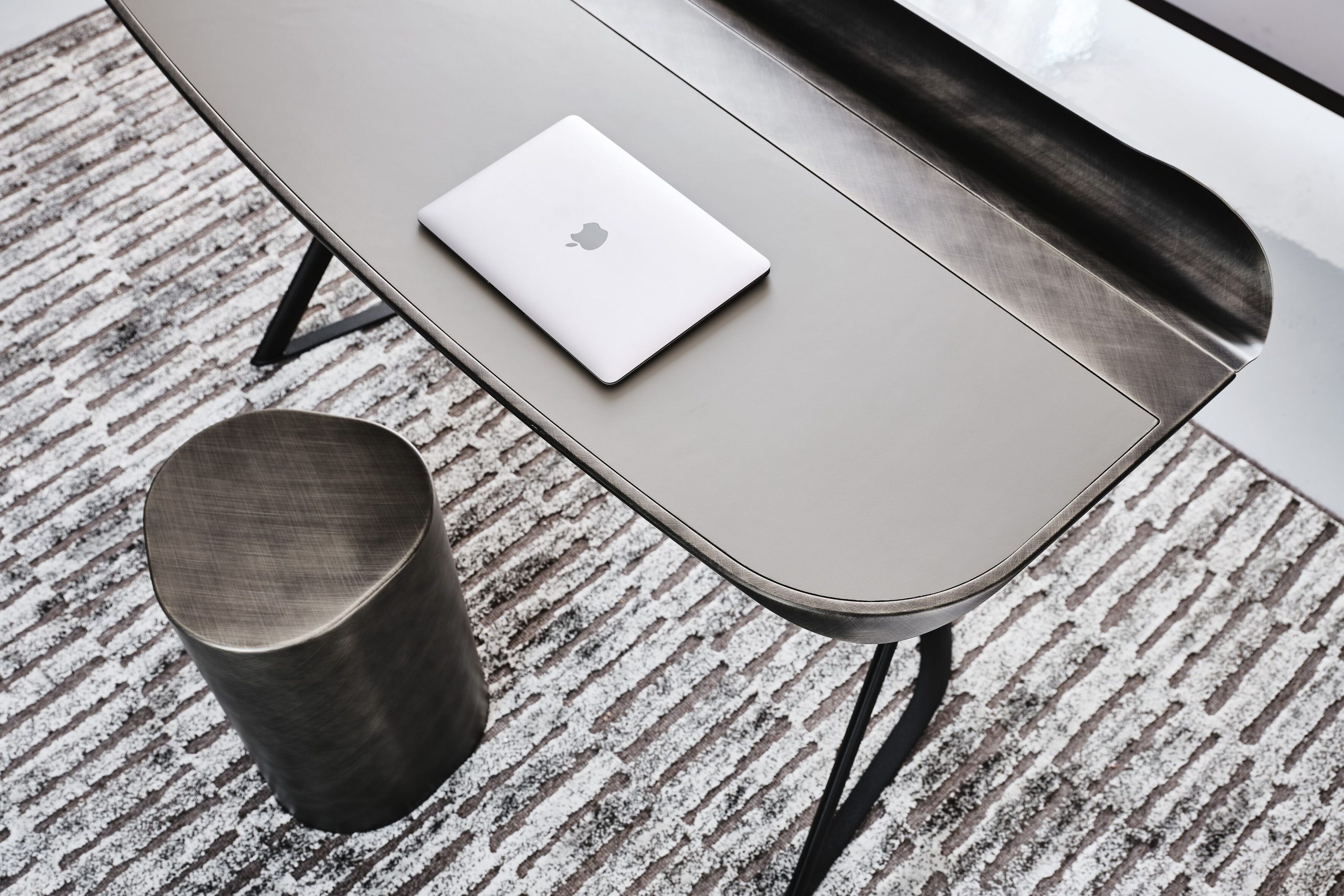 COCOON Leather is a desk with base in titanium (GFM11), bronze (GFM18) or black (GFM73) embossed lacquered steel. Top in leather as per sample card with Brushed Bronze or Brushed Grey lacquered and rounded lower profile and grooved tray in Brushed Bronze or Brushed Grey lacquered steel.