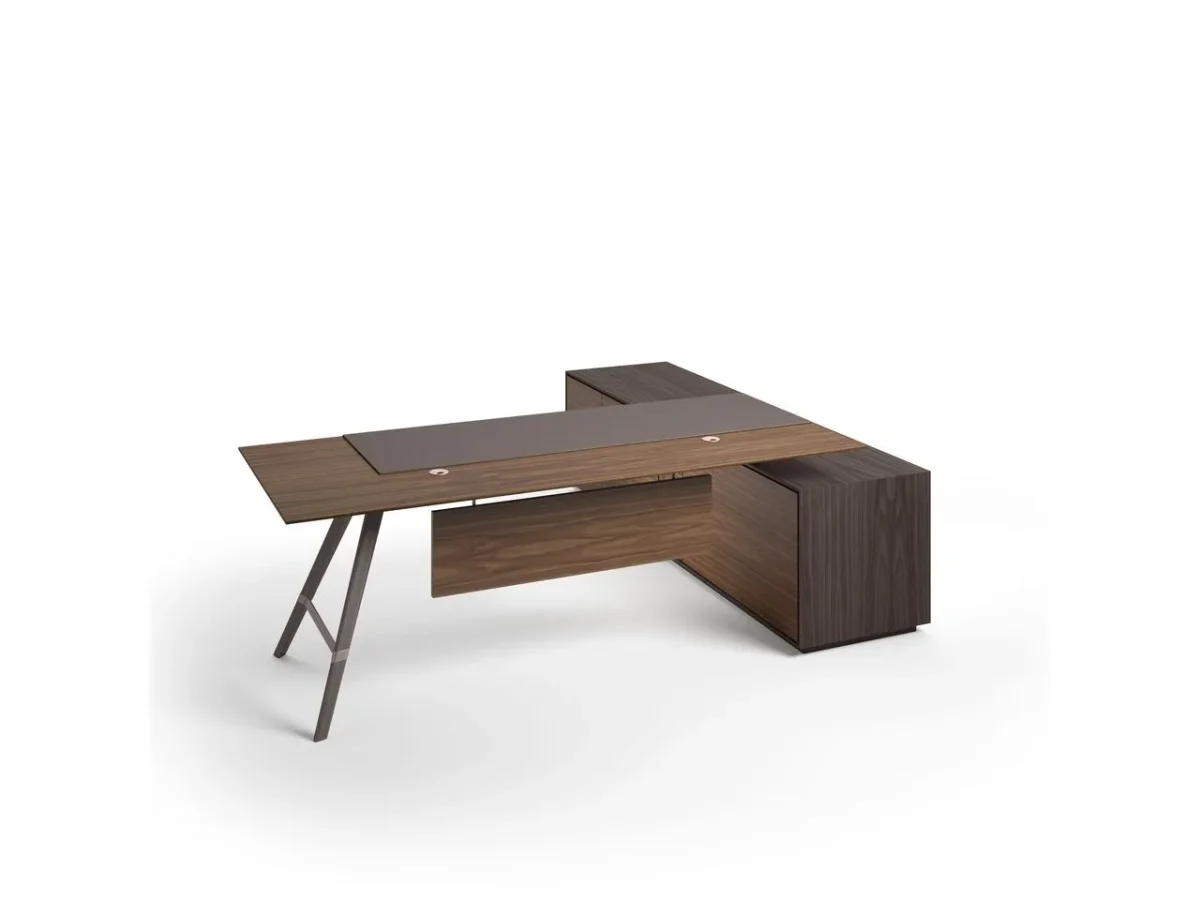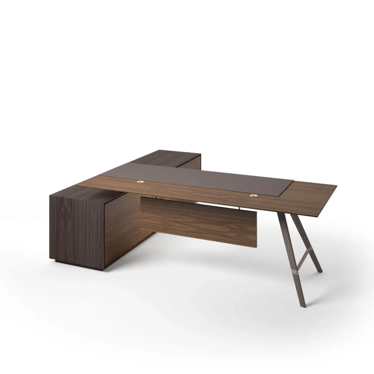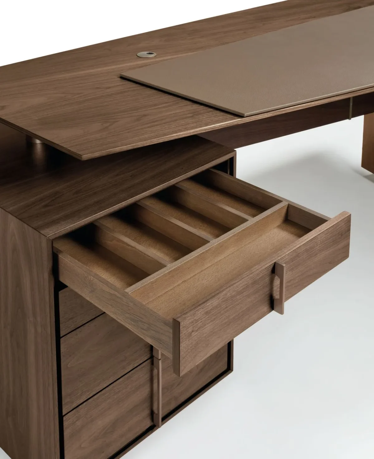 Featuring a leather surface and functional details such as cable management, this desk from the Connect collection is designed to combine efficiency and style. The side drawers offer ample storage space, including compartments dedicated to documentation, with drawers equipped with a soft-close system and internal locks for added security. The sleek silhouette and meticulous craftsmanship make it a distinctive feature for any professional environment.